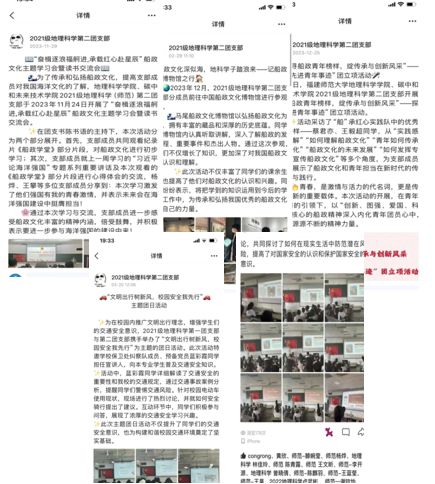 支部成员提前一周使用“学习强国”APP共读《习近平著作选读》《习近平新时代中国特色社会主义思想专题摘编》《论党的青年工作》等著作,学习“习近平论海洋强国”专题系列重要讲话,并写下阅读心得;后召开“奋楫逐浪福舸进,承载红心赴星辰”船政文化主题学习会暨读书交流会。支部成员相互交流阅读经典阅读心得,并共同观看纪录片《船政学堂》部分片段,对船政文化进行初步学习。