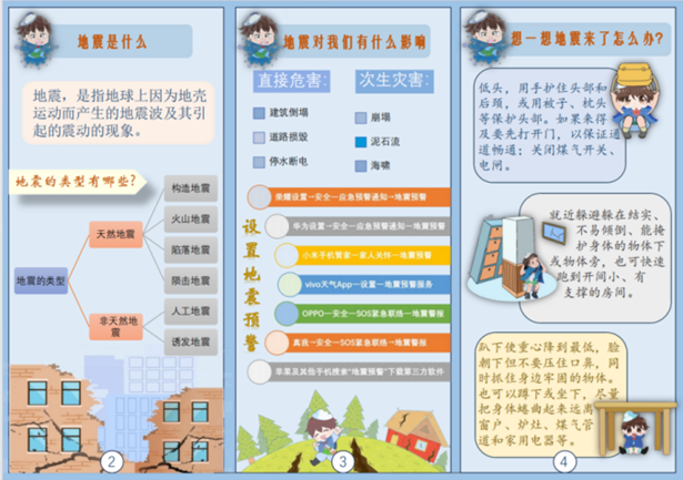 支部设计组成员结合专业特色元素、体验组同学的感想体会,采取“荷包式”折法,制作防灾减灾科普手册,鼓励支部成员提出自己的创意想法,不断完善细化手册,最终打印成实物。