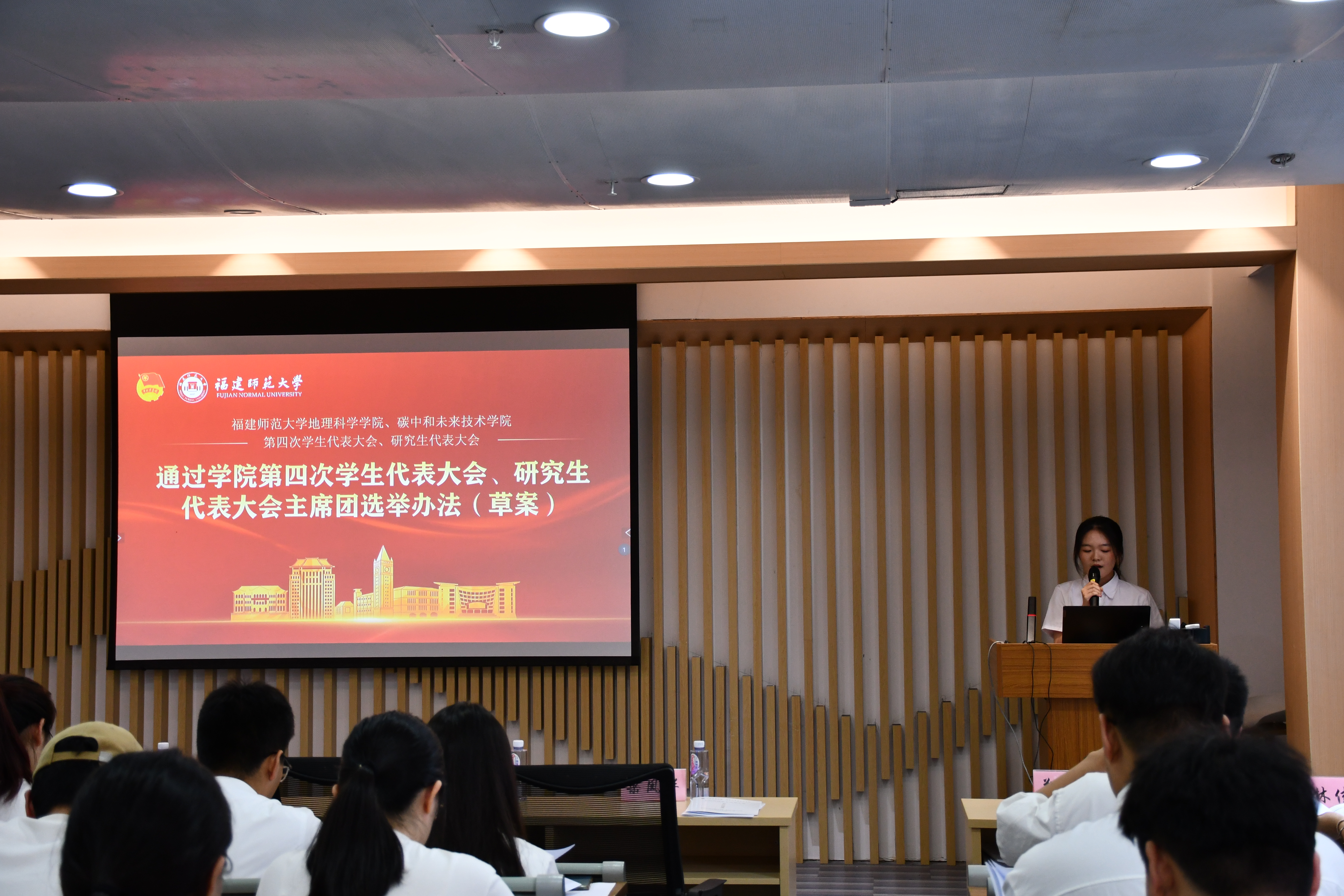 第四届学生会主席团候选人、研究生会主席团候选人依次上台发表竞选演讲。大会审议通过了《福建师范大学地理科学学院、碳中和未来技术学院第四届学生代表大会主席团选举办法(草案)》《福建师范大学地理科学学院、碳中和未来技术学院第四届研究生代表大会主席团选举办法(草案)》,通过了大会总监票人、监票人及总计票人、计票人建议名单,全体代表投票选举产生了我院新一届学生会、研究生会主席团成员。