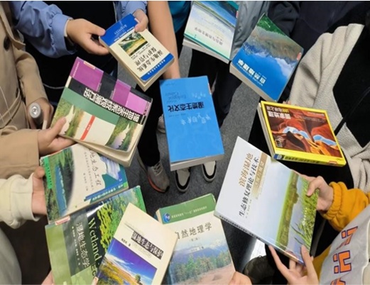 为后续活动进一步奠定理论基础,团支部书记召集支部成员齐聚图书馆,开展湿地相关书籍主题阅读会,支部成员沉浸在相关书籍的海洋中,认真汲取着关于湿地生态、植物学等方面的知识。会议中,支部成员围绕习近平生态文明思想,诵读金句、发言探讨,学习习近平生态文明思想的内涵、理念与意义,深刻体悟到绿水青山就是金山银山的理念,进一步推动绿色发展。