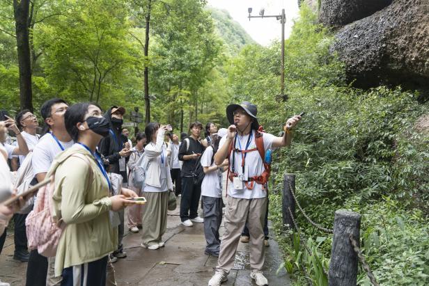 考察过程中,实习队伍登上鸟道,在仅容一人通过的山路上,留下地理学科师生们吃苦耐劳、善于思考、勤于探索的身影。绵阳师范学院艾可可老师重点讲解了剑门关的地层、岩性分布和地貌构造,从丹霞地貌的形成、沉积岩描述方法和剑门关地貌形态,强调研究分析时需具体问题具体分析。重庆师范大学杨前进老师从古地理角度阐述了金牛路的起源,西华师范大学李卫朋老师介绍了蜀道研究的最新进展,西南大学王勇老师则通过提问引导学生掌握实习重点内容。兰州大学李卓仑老师则指出地理研究需要调动五感,用身心感受地理事物并融入个人理解;学生们通过肉眼观察、地质测量和拍摄取证等方法,研究了单斜构造体的形成原因,记录了沿途的节理、断层和褶皱现象,与老师探讨了地质环境演化过程、河流流向,同时对当地人文景观与历史文化有了更为深入的了解。