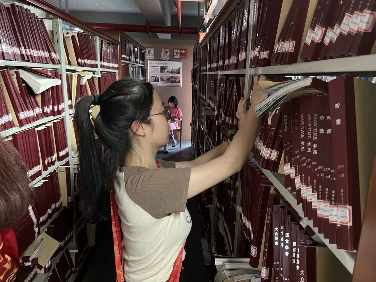 志愿者专注于报刊杂志的分类与整理工作。他们细心核对每一本杂志的标题内容,将杂志合集按年份和类型分类,并统一放置在图书馆指定的区域和书架上,此外还对那些出现破损、卷边或泛黄的杂志进行简单的修复,确保每一本书都保持良好的状态,为读者提供更好的阅读体验。