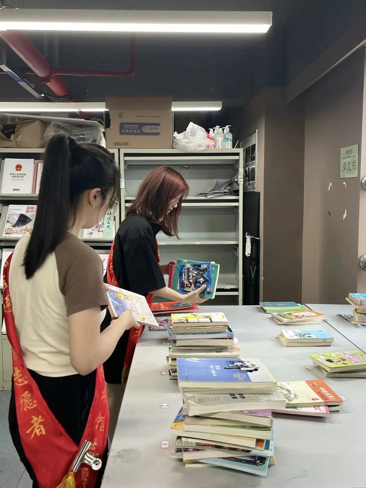 忙碌于分类上架读者归还书籍工作的志愿者,将还书箱内的书籍一一取出,运输到工作区域,依据图书馆的分类体系对收集来的书籍进行细致的分类整理,并进行上架排列。整个工作流程既清晰又高效,充分展现了志愿者们的专业素养和团队协作精神。