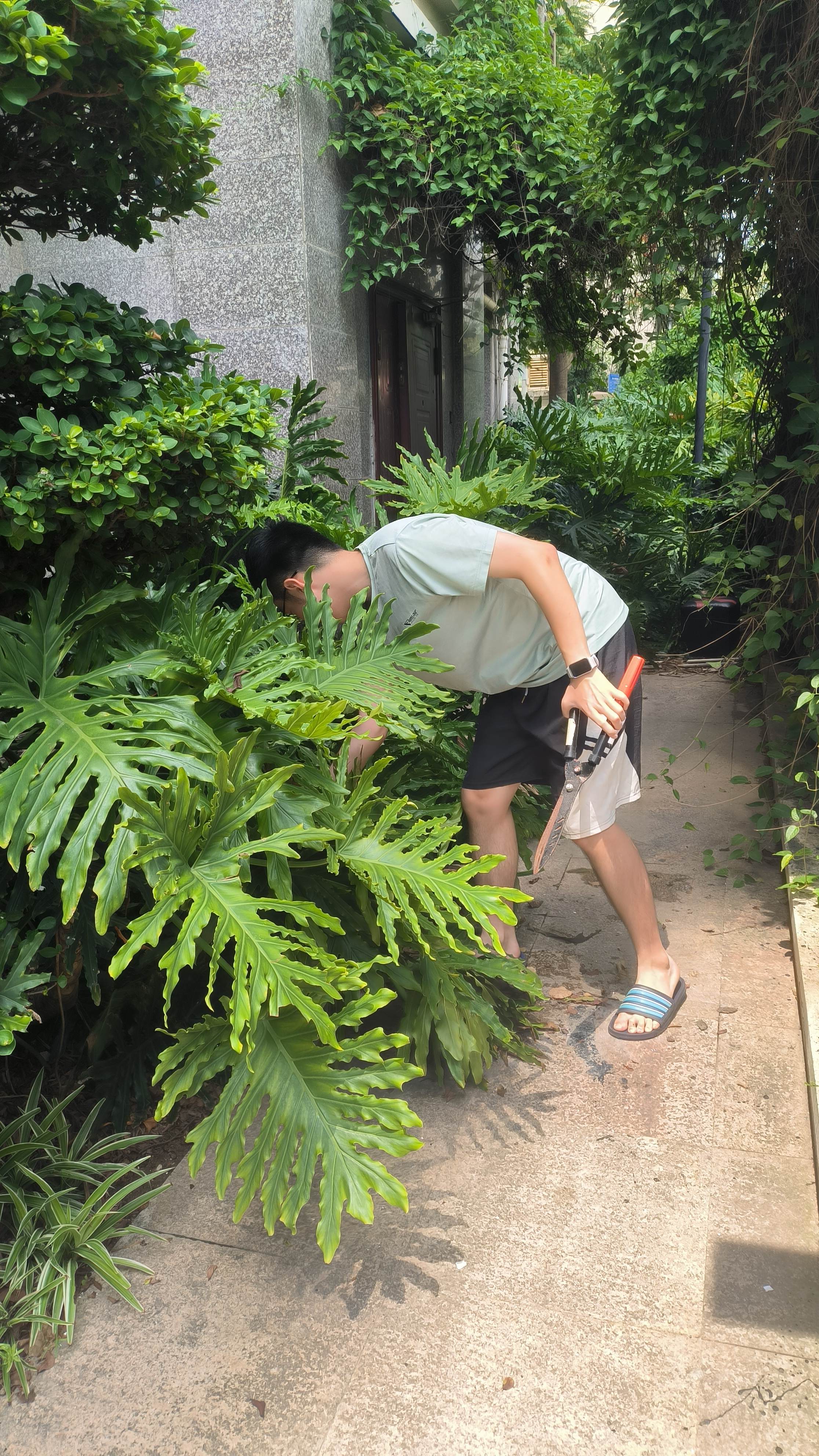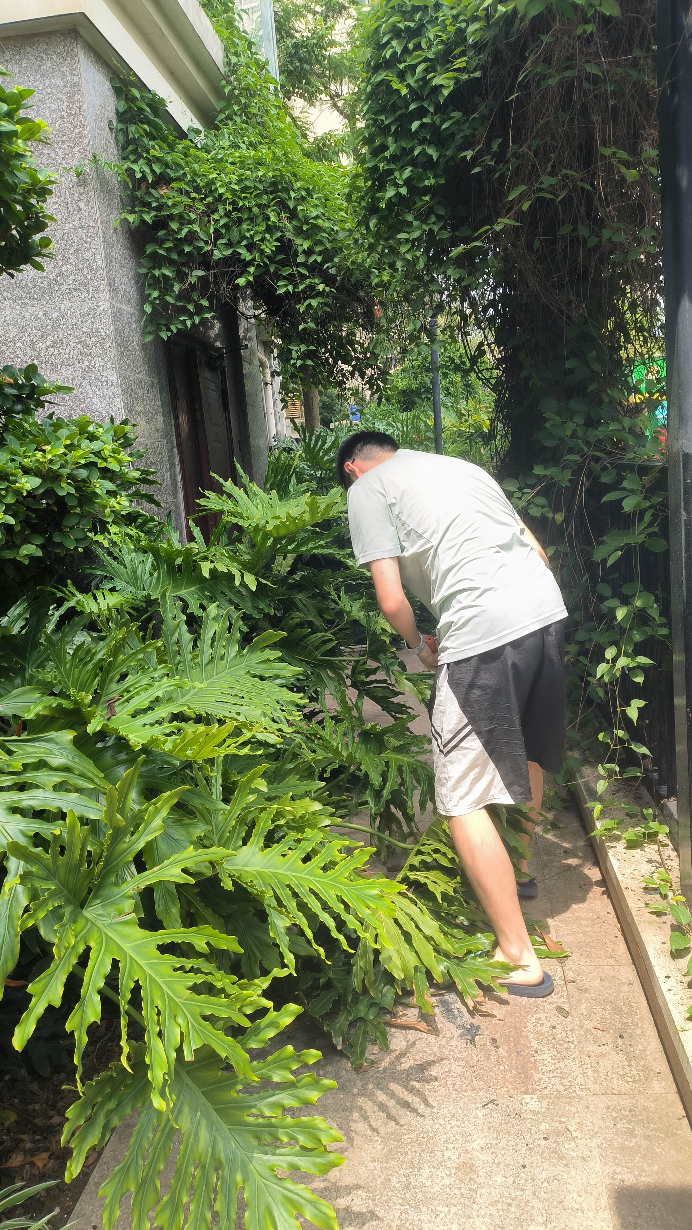 在厦门祥美社区,受台风“格美”影响,社区内部分植物因强风吹拂而东倒西歪,满地的树叶和枝干碎屑让原本整洁的环境变得凌乱不堪。为修缮经台风“格美”侵袭后的家园,志愿者们向社区居委会借来枝剪,加入到了修剪因台风而倒伏的社区植物的队伍中。