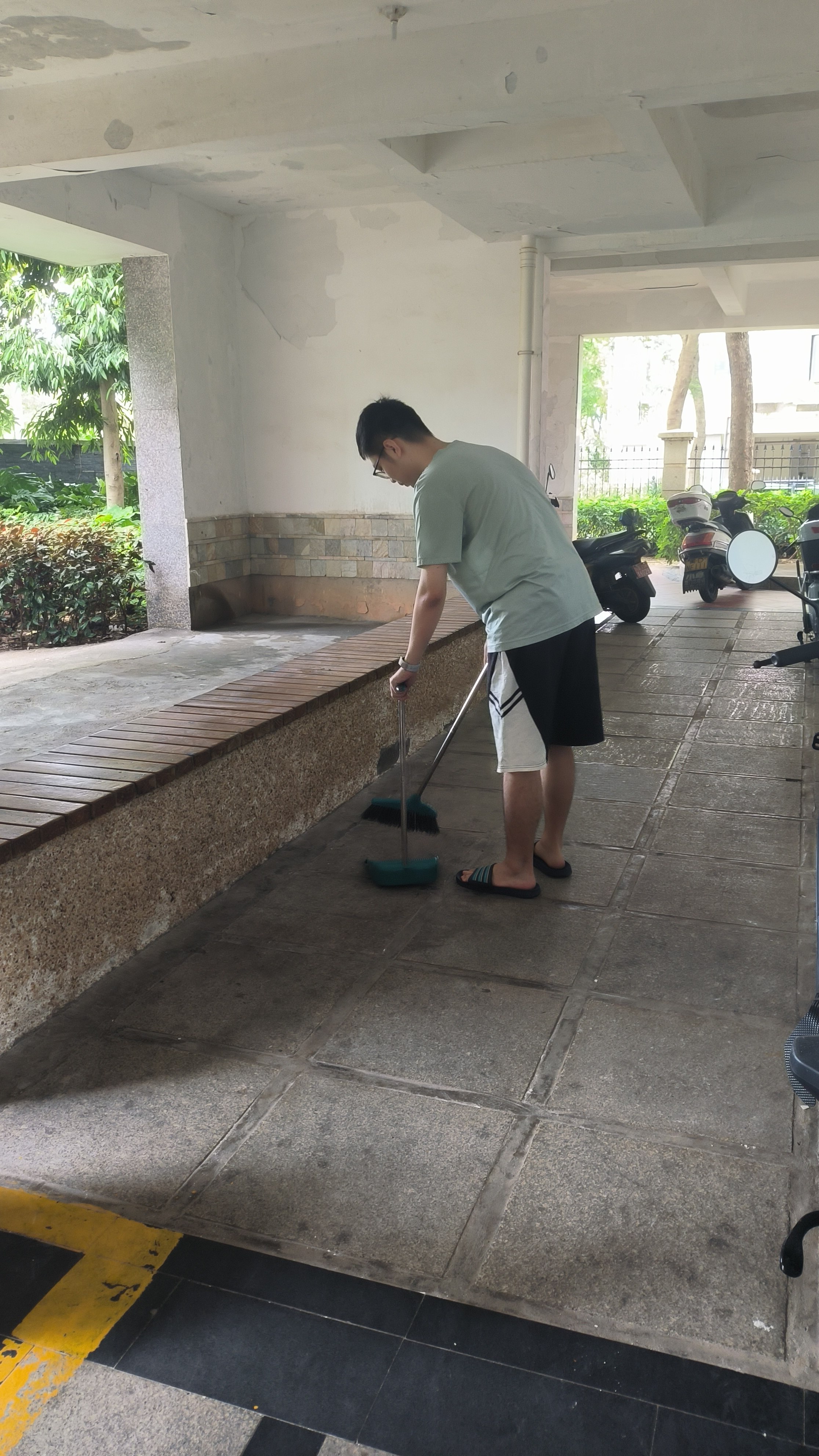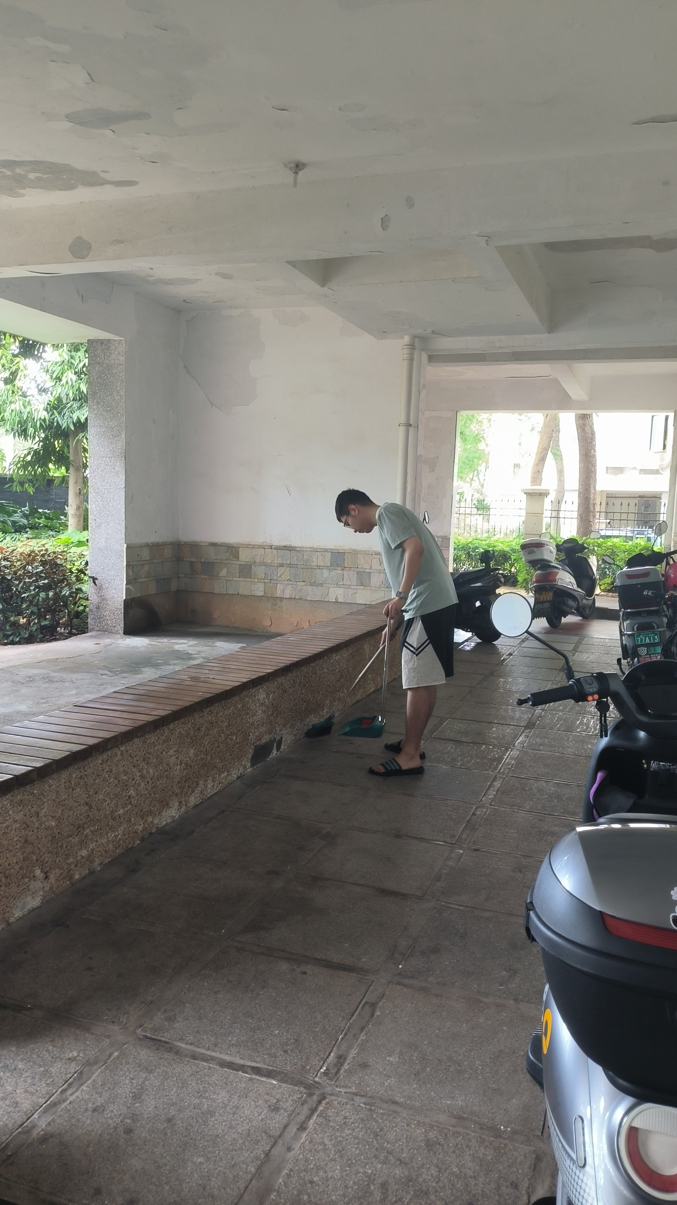 在风灾影响下,社区外道路并未完全清理干净,因此居民大部分仍在居民楼一楼的架空层活动。为保证居民的娱乐活动,志愿服务队伍决定优先清理架空层的垃圾,保证居民享有最临近的、最方便的娱乐空间。架空层内,部分居民为了减轻受到的台风损害,将电动车移入架空层的活动区域,造成不便。因此在清理时,志愿者们先合力将电动车移至靠墙区域,顺序排放,保证居民的活动空间,然后再对活动区域内的卫生进行清理打扫,为居民提供便利的娱乐空间。