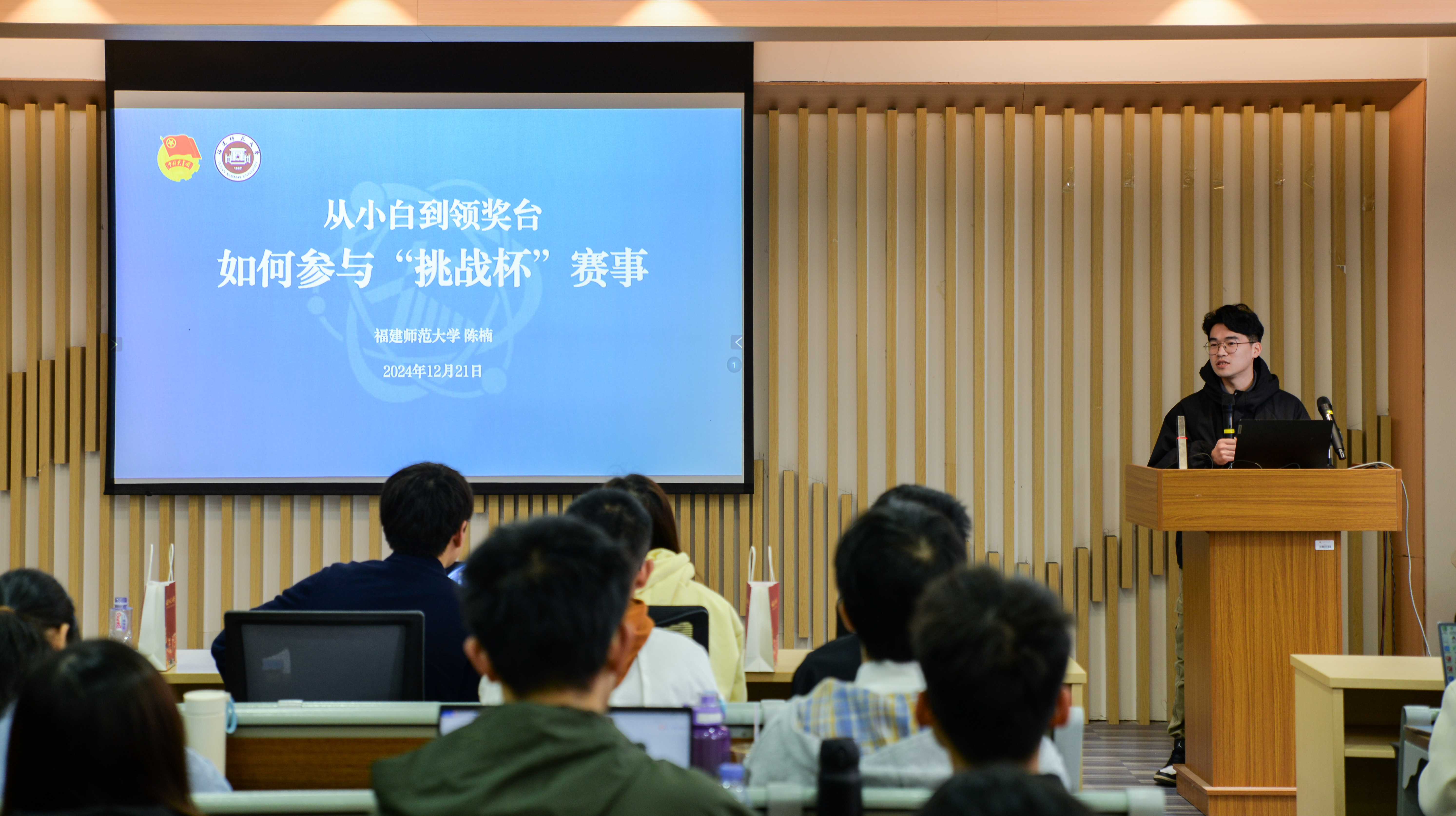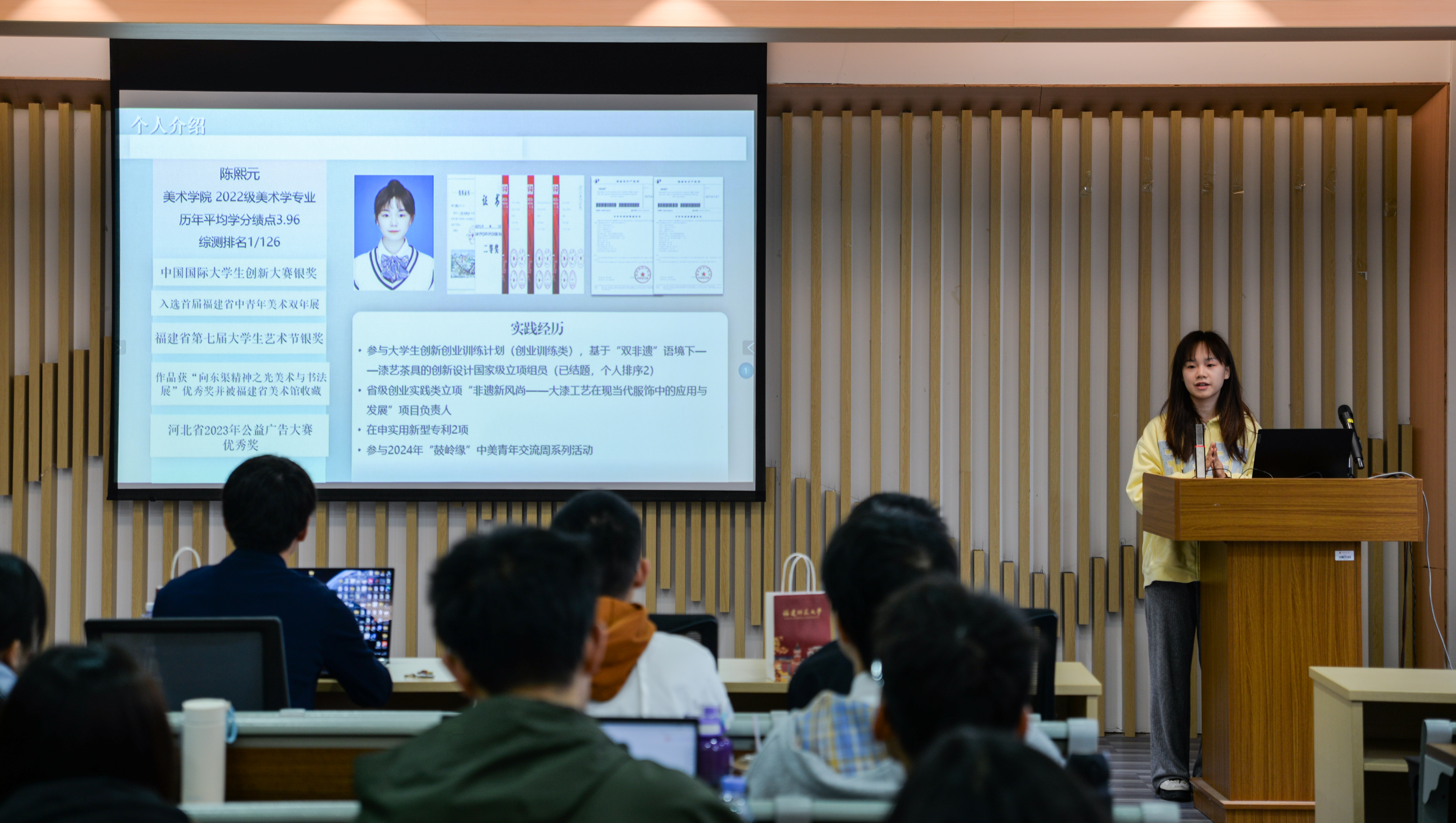 本次交流会共邀请三位来自学院内外的优秀同学分享创新创业竞赛经验。中国国际大学生创新大赛(2024)国家级银奖项目团队负责人、福建省大学生职业规划大赛银奖获得者——光电与信息工程学院徐昊天同学向大家分享了创新创业系列赛事与大创立项比赛的项目内容;以省级创业实践类立项项目“‘零零漆’——国家级非遗漆器文化的实践创新”获国家级银奖团队的美术学院陈熙元同学则着重介绍了参赛要求、参赛流程等注意事项;获第十八届“挑战杯”全国大学生课外学术科技作品竞赛红色专项活动特等奖项目、福建省暑期“三下乡”社会实践活动优秀团队等国家级、省级创新创业奖项十余项的我院陈楠同学结合相关经历分享了如何将项目持续下去的心得和技巧。