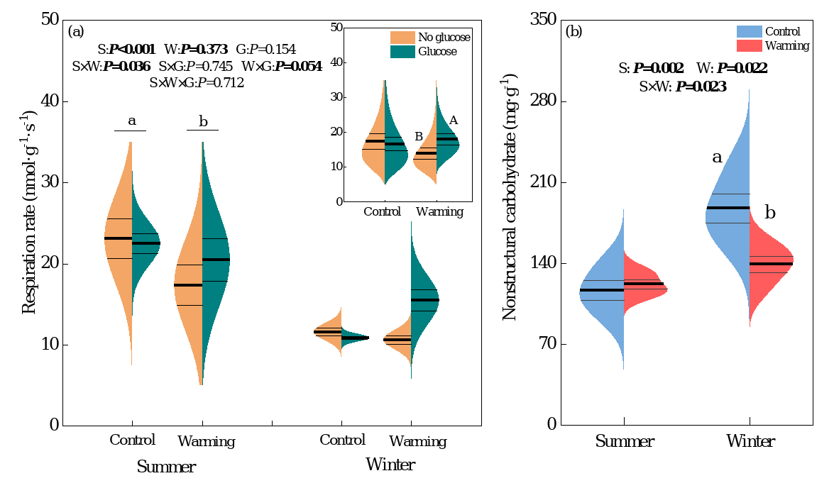 成本-效益理论预测温度升高,细根寿命将缩短;但增温控制试验结果与理论预测并不完全相符,导致气候变暖下细根周转的预测仍具很大不确定性。团队基于福建三明森林生态系统国家野外科学观测研究站的杉木人工林原位土壤增温试验平台,利用微根管对细根动态进行长达4年定位监测,探讨增温对杉木细根寿命的影响及可能机理。结果发现:(1)增温缩短了细根寿命。(2)土壤温度升高对根寿命产生负面影响,而土壤水分降低则延长了根寿命。(3)增温下细根更细、分布更深,且更多分布在冬季;这些因素同时影响了根寿命。(4)葡萄糖添加只在增温下刺激细根呼吸,表明增温下细根受到光合产物供应限制。结论表明,气候变暖导致杉木林细根寿命缩短,从而加速根系向土壤中输入碳,而来自地上的碳供应可能是控制细根寿命的关键生理机制;同时本研究强调了在气候变化下同时考虑温度升高及其共变因素对预测根系寿命的重要性。研究结果以“Soil warming alters fine root lifespan, phenology, and architecture in a Cunninghamia lanceolata plantation”为题发表在国际林学著名期刊Agricultural and Forest Meteorology上,博士生姜琦、贾林巧为共同第一作者,王小红博士后和陈光水教授为共同通讯作者。
