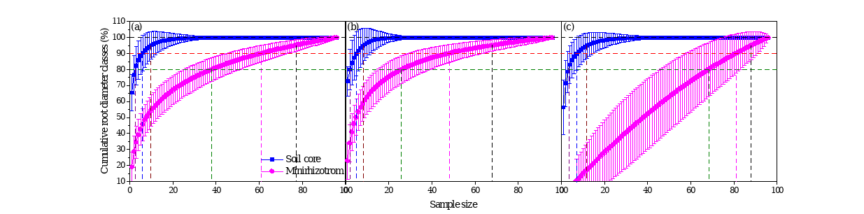 由于细根高度的空间分布异质性及分形分布特征,探讨最佳取样策略在根系研究中至关重要。但以往有关根系取样策略研究仅关注估计精度,而忽略了样本代表性。为此,团队利用亚热带常绿阔叶林96个土芯和96根微根管,研究了根长和根体积(代表根生物量)随直径分布变化,并评估了样本量对估计精度和样本代表性的影响。结果发现:(1)微根管法估算的根系性状变异系数远大于土芯法;微根管法观测到小直径等级的根长和根体积占比较高,比用土芯法观测的根直径更小。(2)蒙特卡罗模拟分析表明,在相同置信水平和估算精度下,土芯法测定根长密度和根体积密度所需样本量远低于微根管法。(3)累积直径等级曲线分析表明,在获得相同样本代表性下,土芯法所需的样本量亦远低于微根管法。结论表明,由于根系直径的分形分布,以及不同方法间土壤取样体积的差异,微根管或直径较大的根系比土芯法或直径较小的根系需要更大的取样量,才能获得更好的估计精度和样本代表性。研究结果以“Root estimation accuracy and sampling representativeness in relation to sample size in a subtropical evergreen broad leaved forest: comparison between soil core and minirhizotron method”为题,发表在国际著名林学期刊New Forests上,博士生朱丽琴为第一作者,林成芳教授和陈光水教授为共同通讯作者。