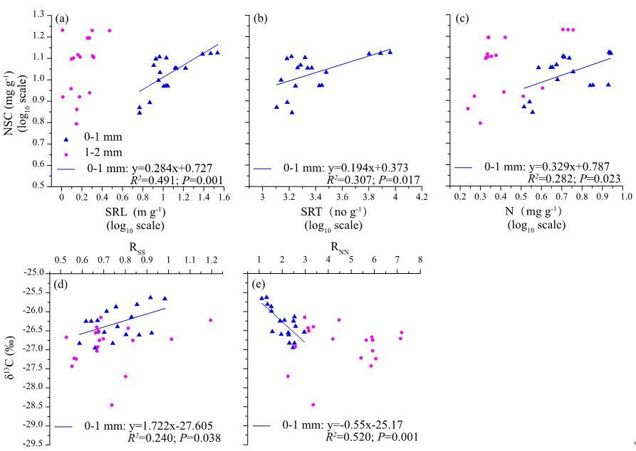 人们对于人工林林分发育过程中细根养分觅食策略变化及影响机制的认识仍存较大空白,这不利于对人工林生长后期生产力下降机制的揭示。团队以具有完整发育阶段的杉木人工林年龄序列为研究对象,对细根养分觅食性状和碳有效性相关性状进行了研究。结果发现:(1)0-1 mm细根的比根长、比表面积和比根尖密度随林龄的增加而降低,说明较老的林分细根养分觅食能力下降。(2)在较老的林分中,非结构性碳水化合物(NSC)及其组分浓度、NSC : N比值较低,而糖淀比和根系δ13C值较高,反映了在林分后期细根碳有效性下降和NSC库利用强度增加。(3)根系NSC浓度与比根长、比根尖密度和N浓度呈正相关,表明根系碳有效性对养分觅食能力有正向影响;根系δ13C值与糖淀比呈正相关,与NSC : N比值呈负相关,表明δ13C能准确反映细根碳水化合物供需平衡。结论表明,较老林分细根养分觅食能力的下降,可能与细根碳限制增加有关。这些结果为了解人工林与林龄相关的生产力下降机制提供了新的视角。研究结果以“Fine root nutrient foraging ability in relation to carbon availability along a chronosequence of Chinese fir plantations”为题,发表在国际林学著名期刊Forest Ecology and Management上,博士生朱丽琴和孙杰高级实验师为共同第一作者,姚晓东副教授和陈光水教授为共同通讯作者。