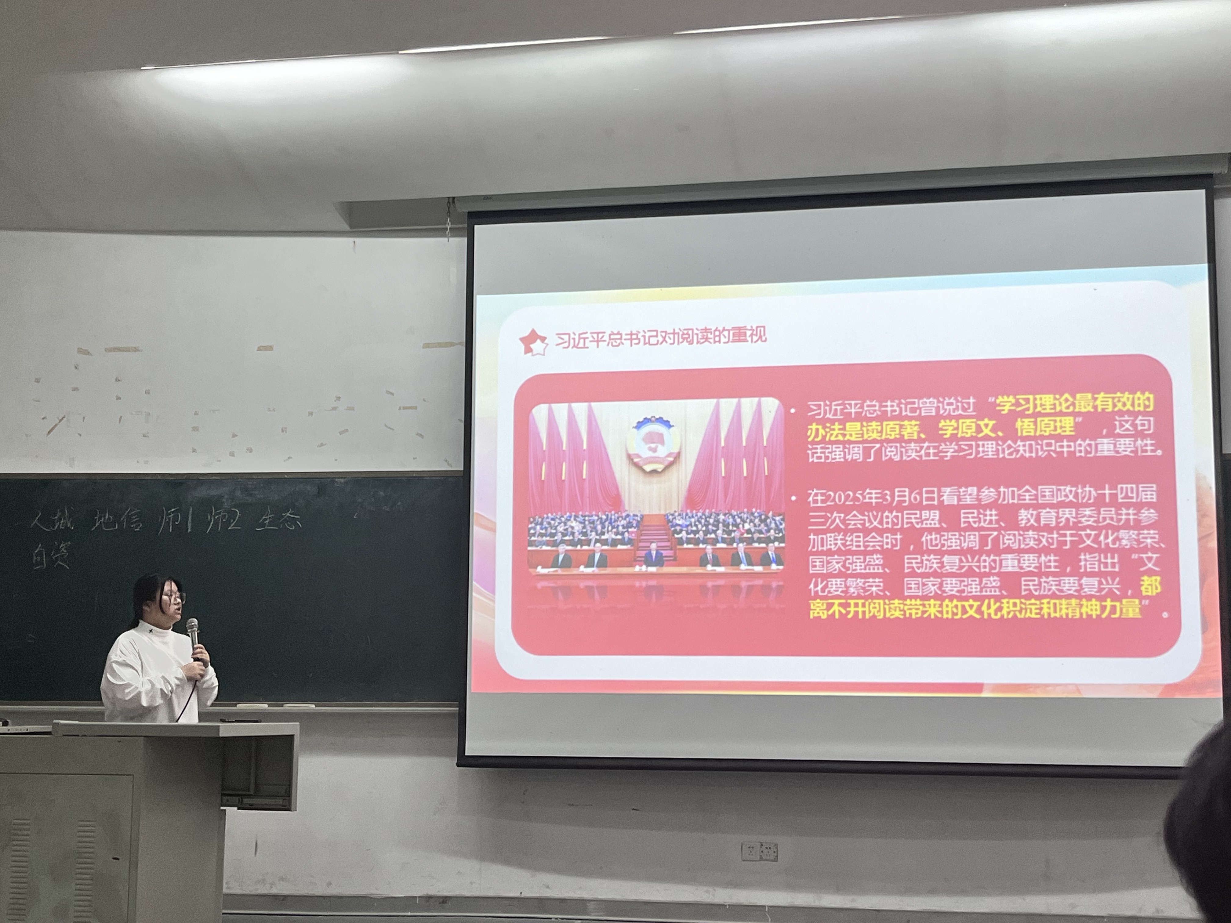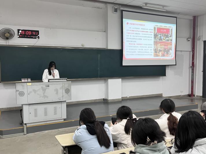 宣讲团成员方韵烨同学为2023级同学分享了习近平总书记的阅读故事,指出阅读在学习工作生活中的重要性。她还介绍了我校校长郑家建教授在今年全国两会民盟、民进、教育界委员联组会上关于阅读的发言要点。