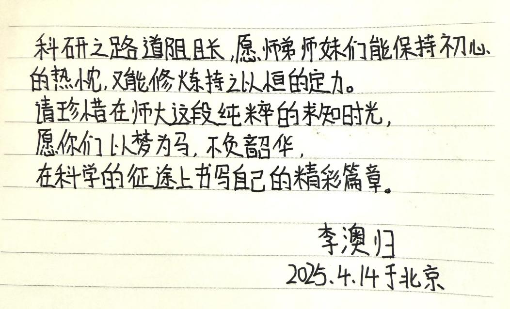 在福建师范大学地理科学学院求学期间,得益于学院先进的实验平台和野外实验站,以及导师毫无保留的言传身教,我不仅掌握了扎实的实验操作技能,更构建起系统的科研思维框架。这段宝贵的科研训练经历,为我奠定了坚实的学术基础。如今在新的博士研究阶段,我依然深切感受到地科院培养带给我的持久影响——规范的实验方法、严谨的逻辑思维、创新的研究视角,这些能力始终指引着我的科研工作。站在新的起点上,我将继续秉持在地科院养成的科研素养,以更加饱满的热情投入学术探索。我深信,这份积淀必将助力我在科研道路上不断突破,取得新的成长。