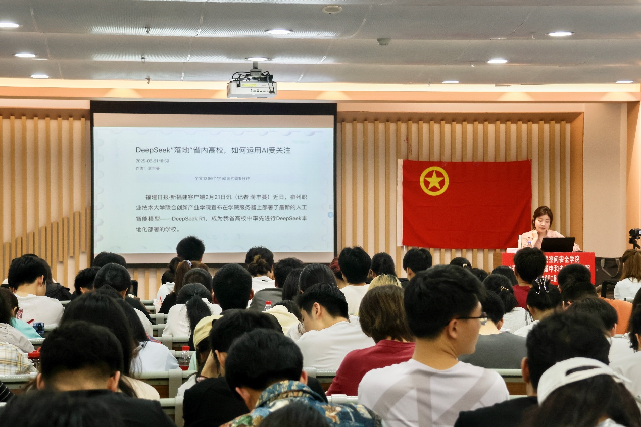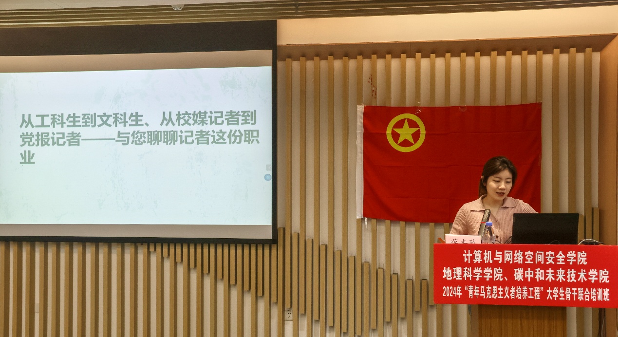 4月12日下午,计算机与网络空间安全学院,地理科学学院、碳中和未来技术学院两院联合青马班邀请福建日报社蒋丰蔓作主题讲座。