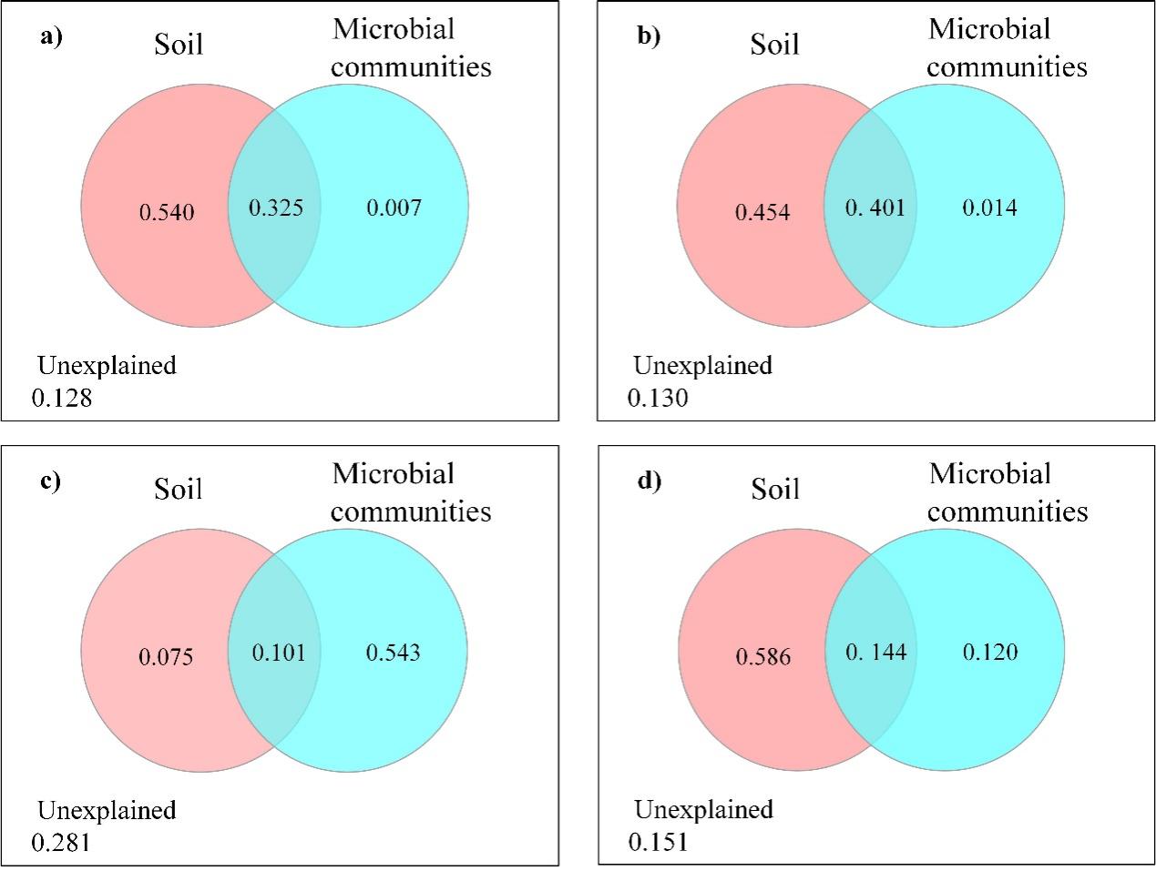 图2 土壤理化性质和微生物群落对土壤微生物碳和养分相对限制影响的方差分解。a)表层土壤微生物碳限制;b)表层土壤微生物养分限制。c) 深层土壤微生物碳限制;d)深层土壤微生物养分限制。值表示每个解释变量所占的方差比例。
