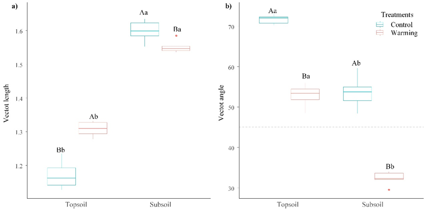 图1 对照和增温处理中表层和深层土壤胞外酶化学计量比的矢量长度和角度 a)矢量长度;b)矢量角度(平均值±标准误,n=5)。不同的大写字母和小写字母分别表示相同深度的对照和增温以及同一处理中两个深度之间的显著差异。