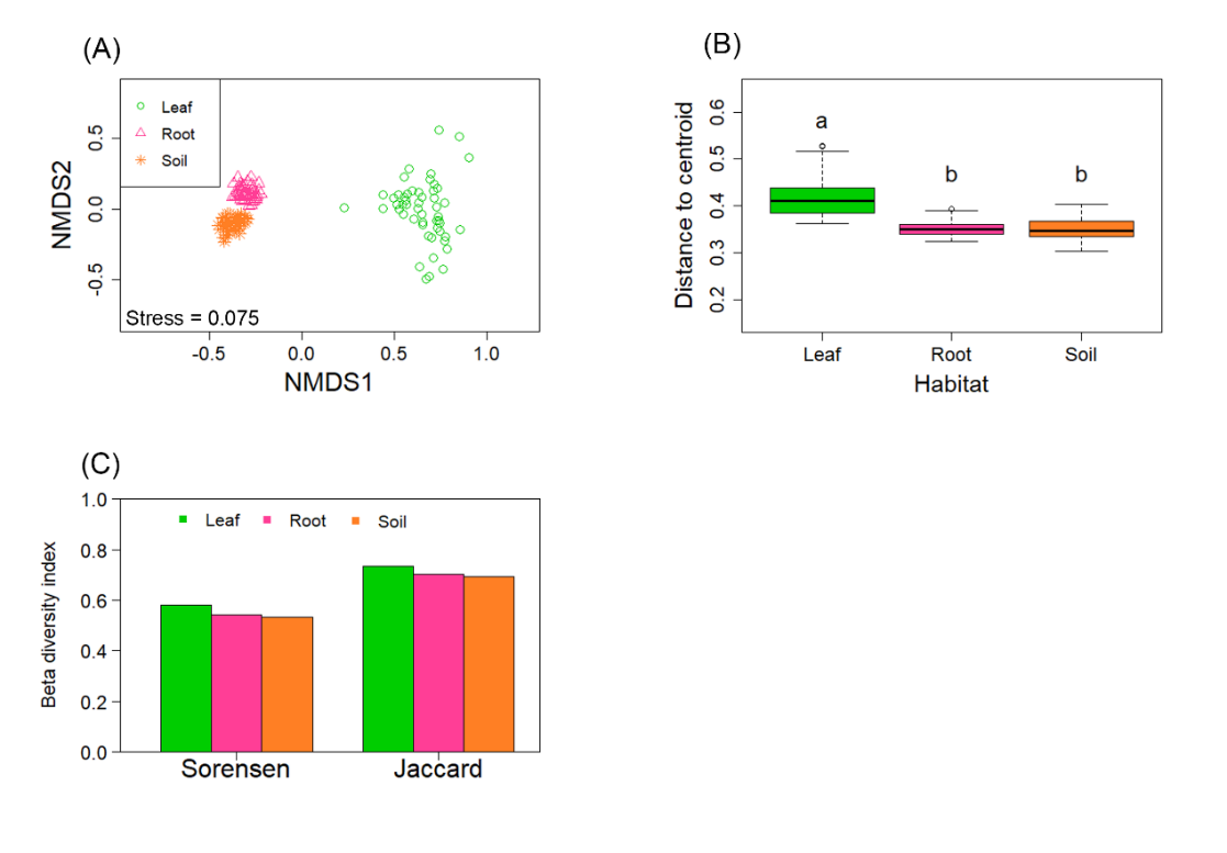 图2.细菌群落组成在树木不同部位差异明显且叶际群落的变异度显著大于根际