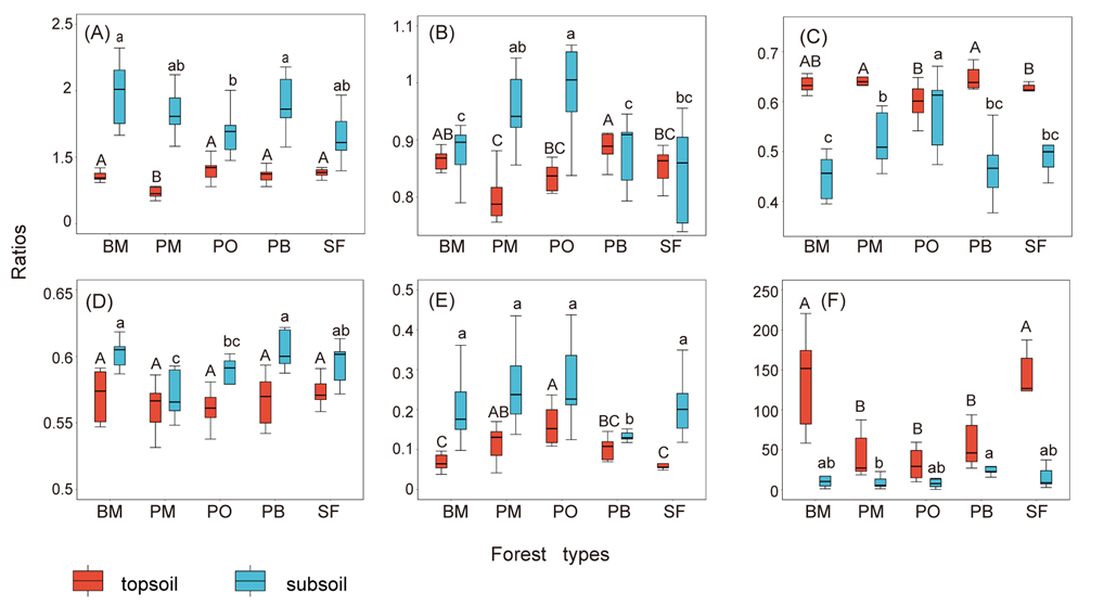 图1.不同森林类型表层土和深层土中土壤胞外酶化学计量的多重比较分析