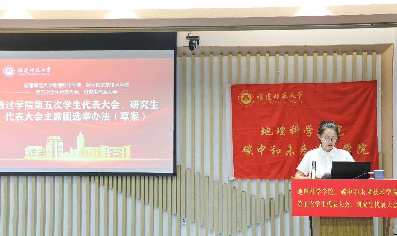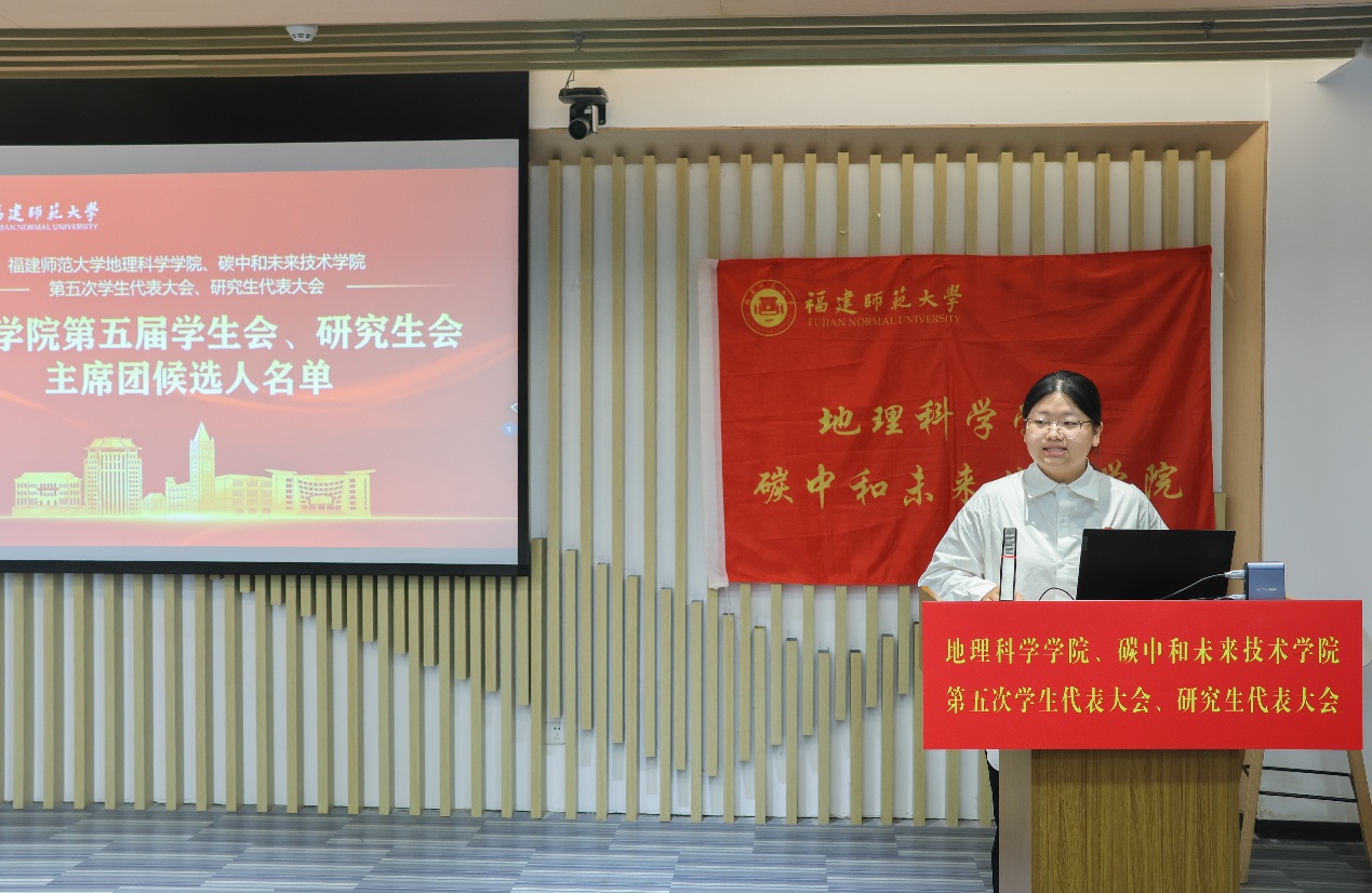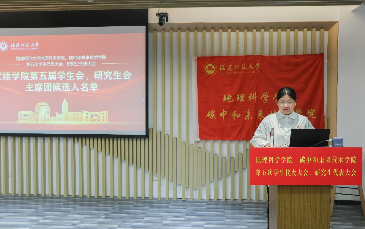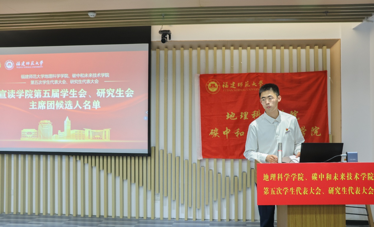 第五届学生会主席团候选人、研究生会主席团候选人依次登台发表竞选演讲。他们结合自身经历和优势,阐述了对学生会、研究生会工作的理解和认识,提出了未来工作的设想和规划,展现了新时代青年学子的责任担当和创新精神。大会审议并通过了《福建师范大学地理科学学院、碳中和未来技术学院第五届学生代表大会主席团选举办法(草案)》《福建师范大学地理科学学院、碳中和未来技术学院第五届研究生代表大会主席团选举办法(草案)》,通过了大会总监票人、监票人及总计票人、计票人建议名单。全体代表认真履行职责,通过无记名投票的方式,选举产生了学院新一届学生会、研究生会主席团成员。