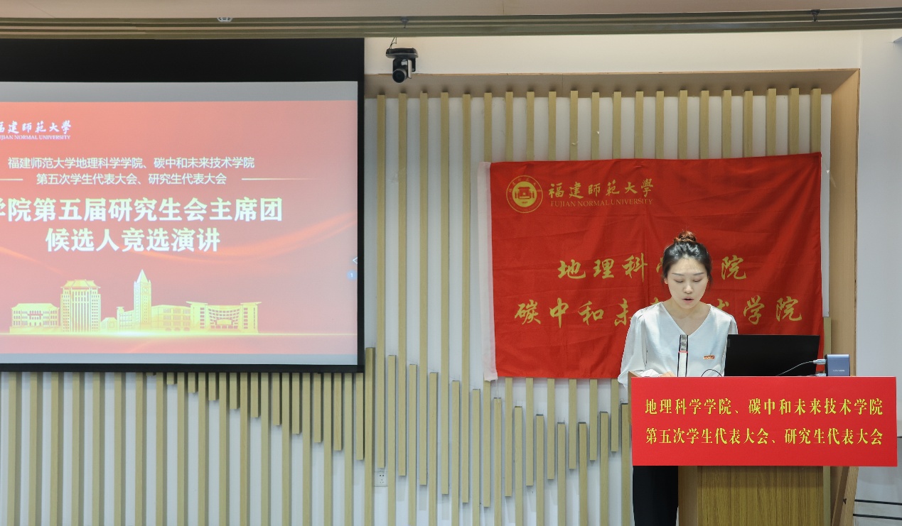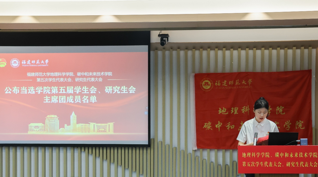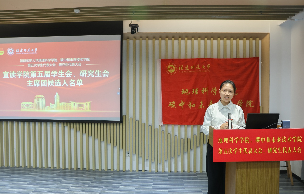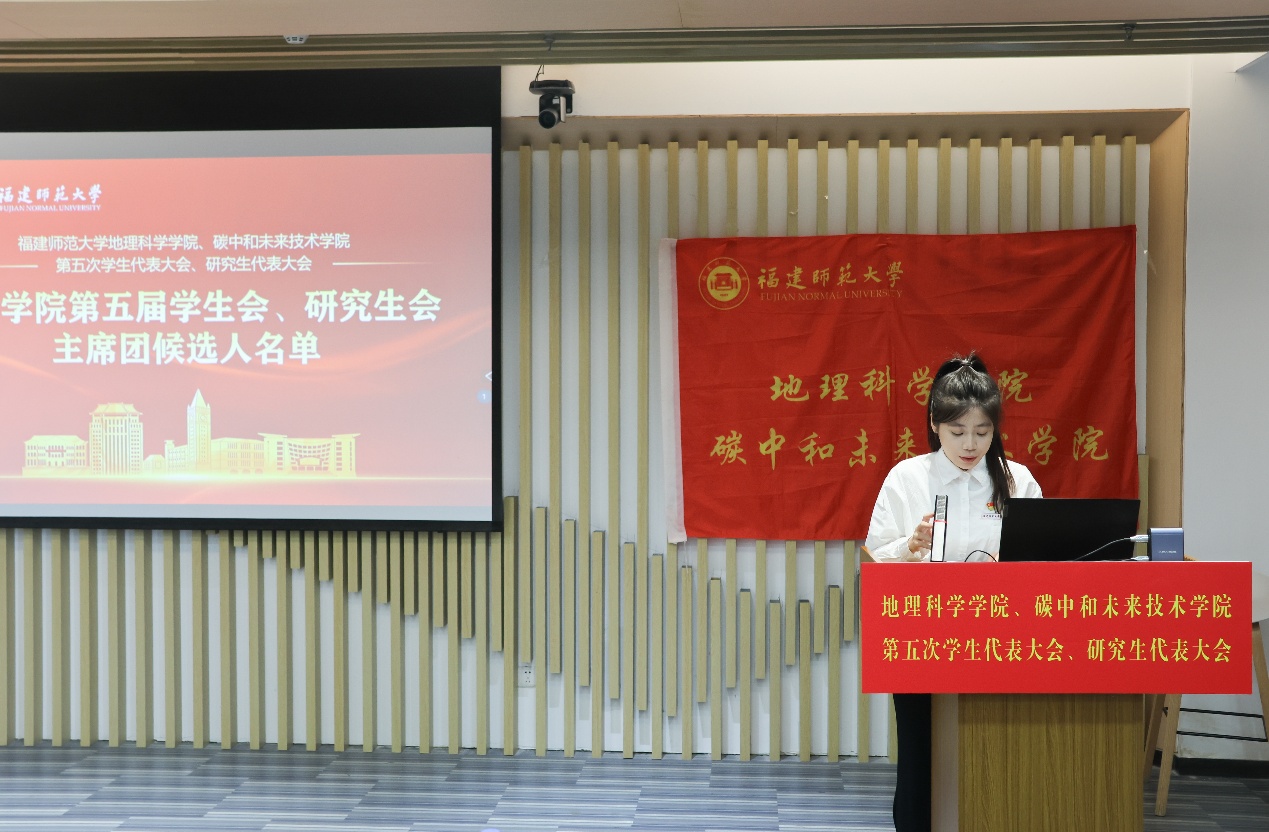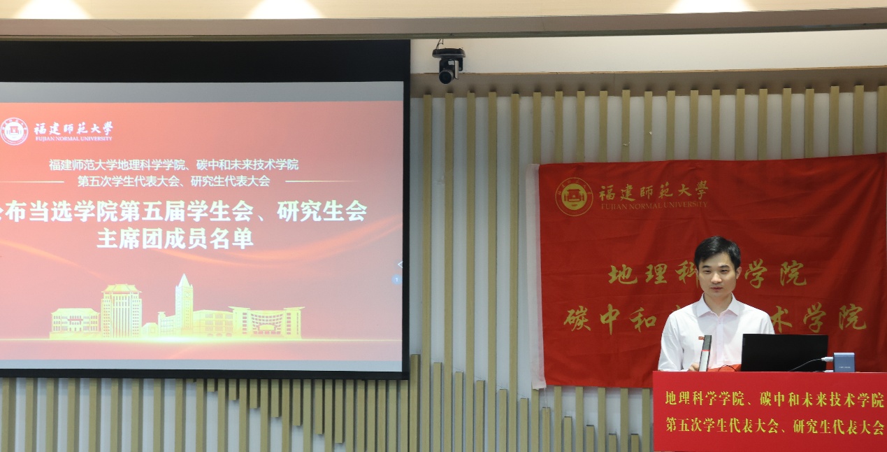第五届学生会主席团候选人、研究生会主席团候选人依次登台发表竞选演讲。他们结合自身经历和优势,阐述了对学生会、研究生会工作的理解和认识,提出了未来工作的设想和规划,展现了新时代青年学子的责任担当和创新精神。大会审议并通过了《福建师范大学地理科学学院、碳中和未来技术学院第五届学生代表大会主席团选举办法(草案)》《福建师范大学地理科学学院、碳中和未来技术学院第五届研究生代表大会主席团选举办法(草案)》,通过了大会总监票人、监票人及总计票人、计票人建议名单。全体代表认真履行职责,通过无记名投票的方式,选举产生了学院新一届学生会、研究生会主席团成员。