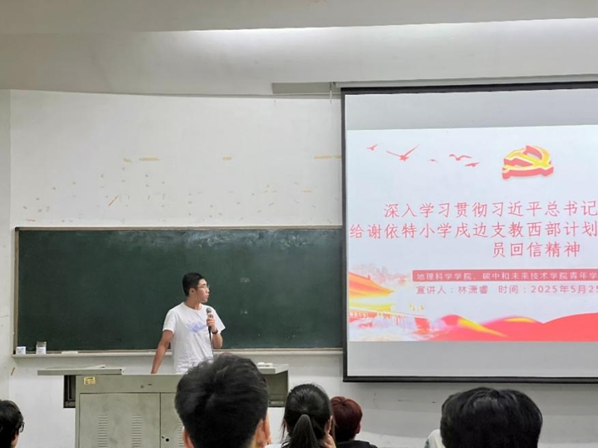 宣讲团成员林潇睿介绍了谢依特小学戍边支教志愿者服务队的事迹。这所距离边境线仅47公里、主要由柯尔克孜族学生组成的村级小学,自2022年8月成为克州首个西部计划志愿者包校支教的试点学校以来,志愿者们因地制宜探索教学方法,多次开展家访,还开设了科学实验课、兴趣小组等,为当地教育事业发展注入了新活力。宣讲后,参会同学表示戍边支教志愿者们响应党的号召,扎根边疆,不仅促进了当地教育事业的发展,更在促进民族团结进步中发挥了积极作用,他们是当代青年大学生学习的榜样。