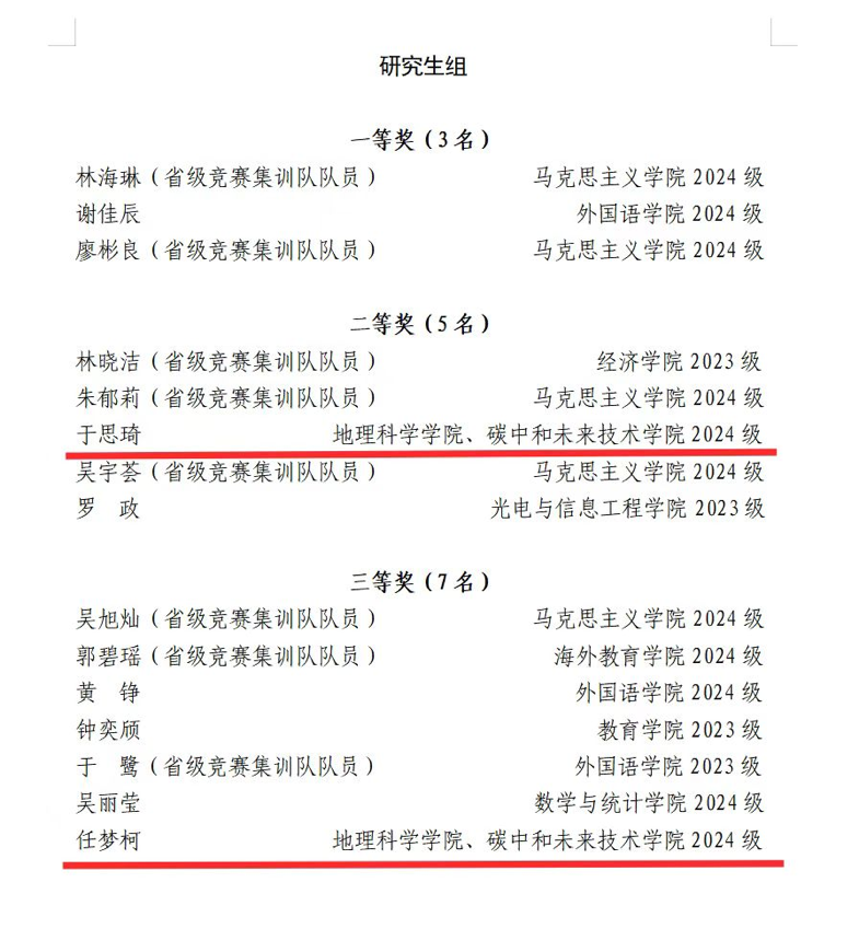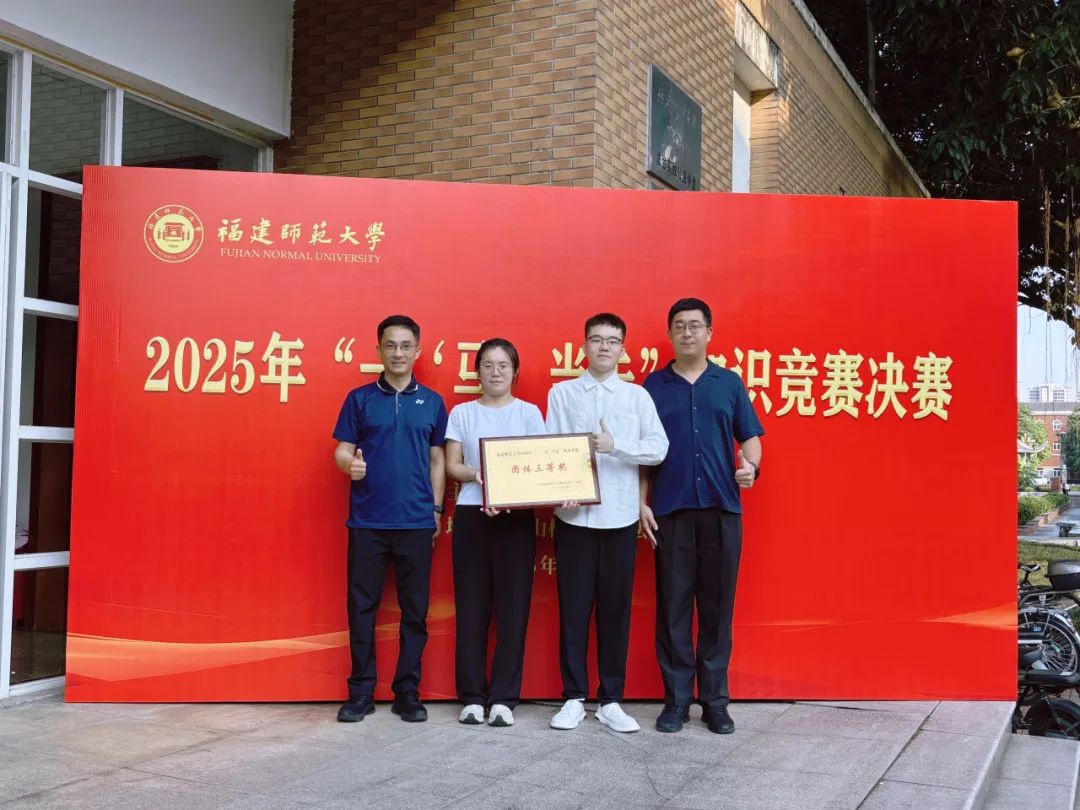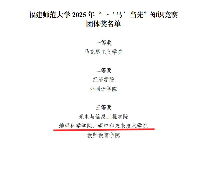 近日,福建师范大学2025年“一‘马’当先”知识竞赛结果公布。我院荣获团体三等奖,我院2024级研究生于思琦获研究生组二等奖,2024级任梦柯研究生获研究生组三等奖。