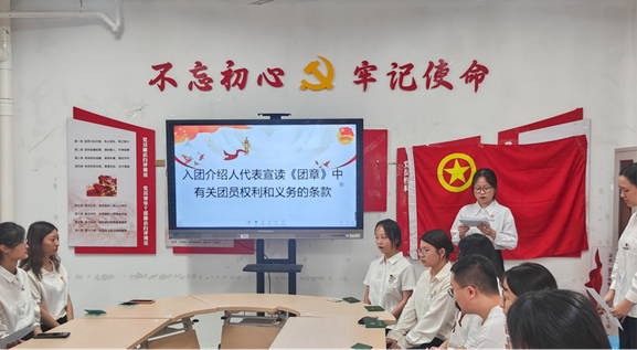 入团仪式在庄严的国歌声中开始。王煊鸿宣读新团员名单,邹秀琦、郑晨宇、郑新杰为新团员佩戴团徽并颁发团员证。在领誓人的带领下,全体新团员举起右拳,面向团旗庄严宣誓,与会老师和老团员一同重温入团誓词。随后入团介绍人代表蓝叶琳同志宣读了团章中有关团员义务和权利的内容。