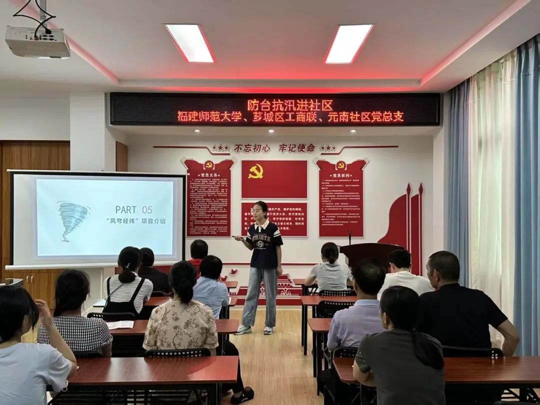 宣讲中,实践队展示了“风穹经纬”项目,通过高科技手段助力台风防范。他们介绍了项目团队研发的台风监测系统和数据分析模型,展示了如何通过这些技术提前预测台风路径、评估灾害风险,并为社区提供精准的防台建议。实践队成员张乐萱表示:“我们希望通过科技的力量,为社区居民提供更科学、更精准的防台减灾服务。”