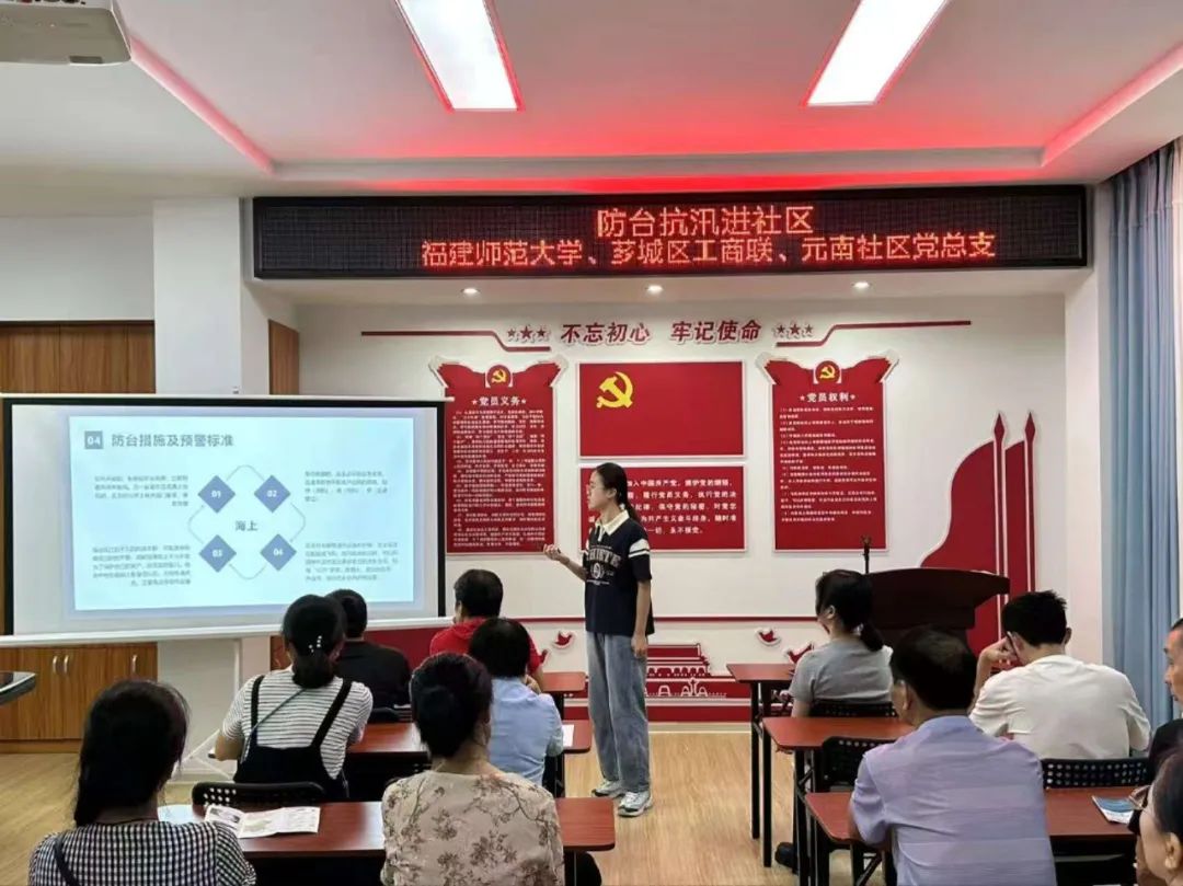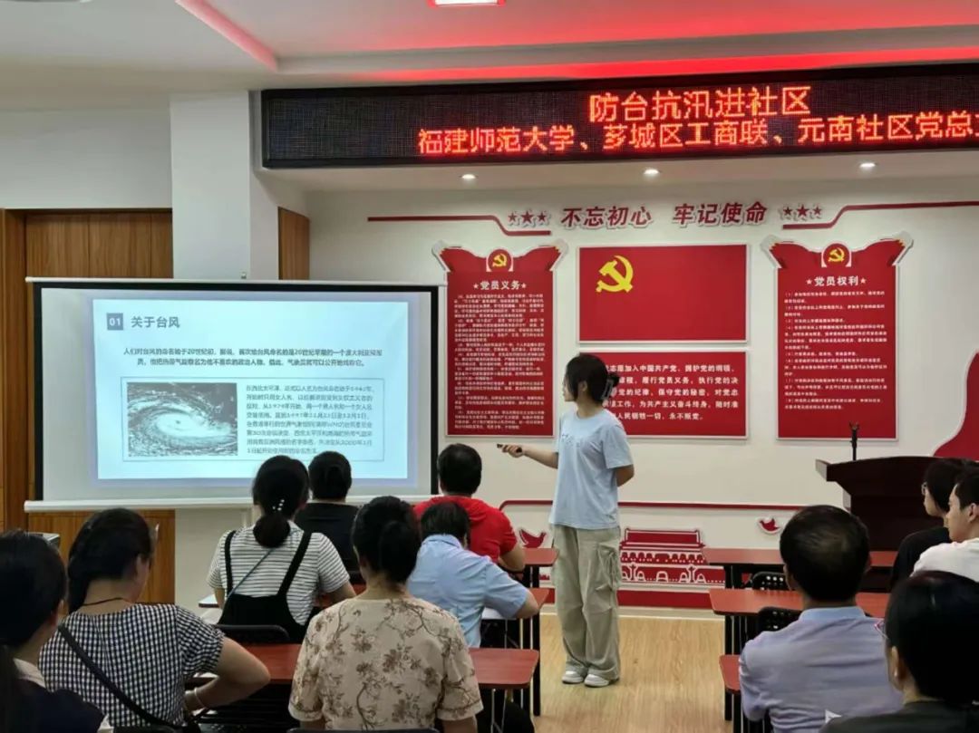 在元南社区活动中心,实践队成员通过生动的讲解和互动环节,向居民们介绍了台风的基本知识、预警信号的含义以及台风来临时的注意事项。宣讲内容涵盖了台风的定义、结构、路径、预警信号等,旨在提高居民们对台风的认识和自我保护能力。成员们还通过播放动画视频、现场模拟等方式,让居民们更加直观地了解台风的危害和防范要点。