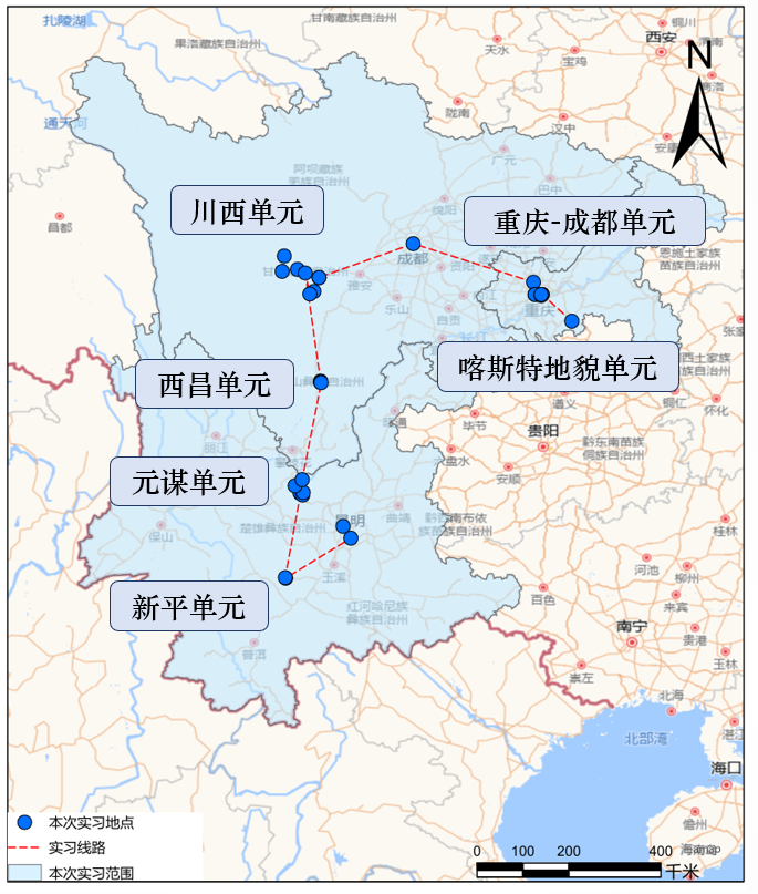 实习以“行走在阶梯边缘”为主题,聚焦青藏高原东南缘-横断山脉地区这一地理过渡地带。实习队伍从重庆市区出发,依次探访了重庆城市规划建设、金佛山喀斯特桌山,四川成都历史街区改造、大渡河干热峡谷、贡嘎山海洋性冰川、康定高山草甸、西昌高原湿地,以及云南元谋干热河谷、新平花腰傣民族小镇等,最终抵达春城昆明,全程累计行程超过2000千米。一路上,实习师生们翻山越岭,面对酷暑与高原高海拔的艰辛与挑战,大家秉持团结互助、交流共进的精神,共同探究现实地理问题,每一位参与者都收获颇丰。