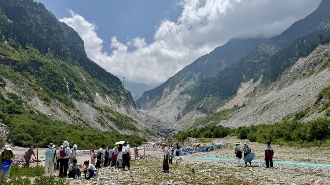 城门洞,是因冰川融水侵蚀而得名,却因近几十年来的全球变暖逐渐消失。实习师生沿着贡嘎冰川河谷而下,在城门洞观察了侧碛垄、“豆浆水”等冰川地貌及水文现象,探究红石滩乔利橘色藻的生态适应策略,追踪冰川退缩后的植物演替序列。杨老师呼吁大家关注冰舌退缩的问题,当消融量持续超过积累量时,冰川末端就会出现系统性的退缩,这一现象虽然进行缓慢,却对冰川地貌影响极大,反映了人类活动间接对自然环境产生的作用,引发了大家对于人地关系这一地理学核心命题的思考。通过实地考察与样本观察,师生们深刻认识到冰川消融的严峻现实,强化了守护生态环境的责任感与使命感。