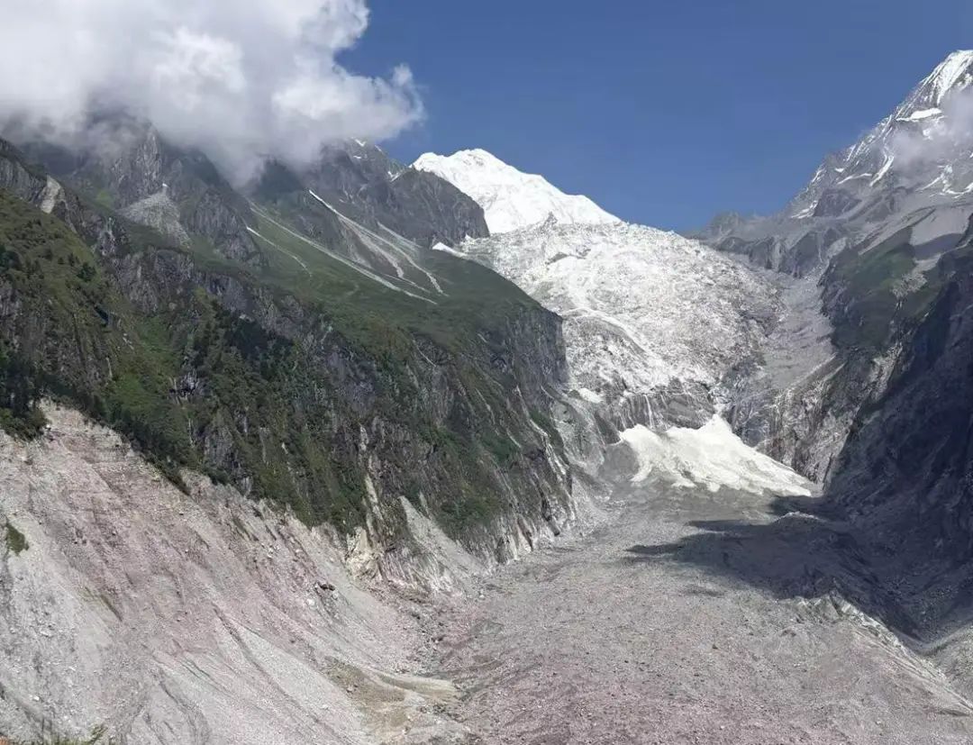贡嘎山地处东部亚热带暖湿季风气候向西部青藏高原高寒气候区的过渡带,东坡受东南季风影响,西坡受西南季风影响,降水充沛,冰川的补给量大;加之山高谷深、地势高差悬殊,高海拔的低温环境为冰川发育创造了必须的低温条件。重庆师范大学杨前进老师从冰川的颜色特点、物质组成和微地貌三个方面解释了海洋性冰川和大陆性冰川的不同,并引导实习队员们观察了粒雪盆、角峰、刃脊、冰舌等冰川地貌。