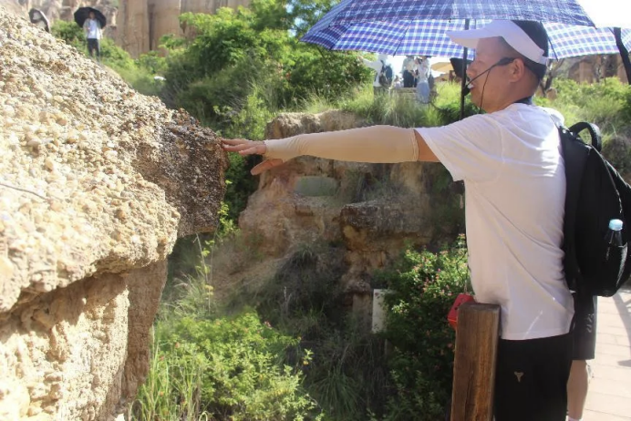 师生们穿行其间,西华师范大学的李卫朋老师引导大家观察土柱顶部的“铁盖”(铁质胶结层)。他解释道,这些坚硬的“帽子”是富含铁质的地下水在毛细作用下上升至地表,经蒸发富集氧化而成,其硬度远超下部的砂砾岩,能有效抵抗雨水侵蚀,从而保护了下方的土柱,是土林得以保存至今的关键因素。通过对土林物质组成、沉积序列和侵蚀形态的细致观察,同学们深刻理解了内外力地质作用是如何共同雕琢出如此震撼的地貌景观。