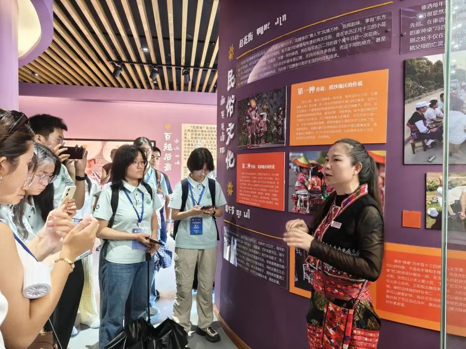 考察的重点是花腰傣文化传习馆。讲解员介绍,花腰傣因其色彩绚丽、层层束于腰间的彩锦腰带而得名。他们的信仰与习俗,如万物有灵、使用竹篾法器“达辽”等,都展现了独特的文化面貌。最令人惊叹的莫过于花腰傣的服饰,被誉为“穿在身上的史诗”。师生们在工作坊近距离欣赏了巧夺天工的刺绣与织锦,这些“以针为笔、以线为墨”的精美服饰,不仅是审美的表达,更是族群记忆、自然崇拜与文化认同的载体,生动诠释了特定地理环境中文化多样性的璀璨。