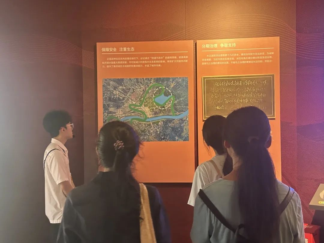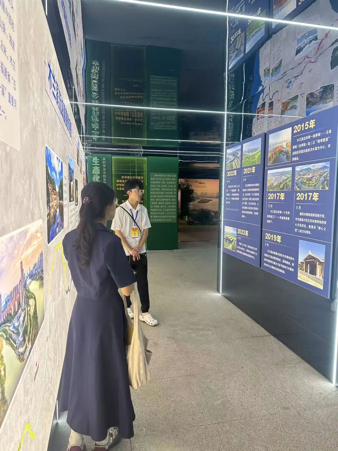 在讲解员的带领下,实践队成员进入展馆参观。依据讲解,实践队成员了解到木兰溪曾是莆田人民的“心头之患”,作为福建省唯一流经人口密集区未设防的独流入海河流,它在历史上洪涝频发,给当地人民带来了巨大的灾难。然而,木兰溪治理的转折始于习近平同志在闽工作期间的直接推动。1999年,他提出“变害为利、造福人民”的目标,主导科学论证并奠基一期防洪工程。从那时起,木兰溪的治理工程正式拉开序幕。实践队成员在木兰溪治理展示馆中,通过历史影像、工程模型,直观地感受到了治理工程的艰难起步与伟大转折。这些展板不仅展示了木兰溪治理的艰辛历程,更让我们看到了习近平总书记对生态文明建设的远见卓识和坚定决心。