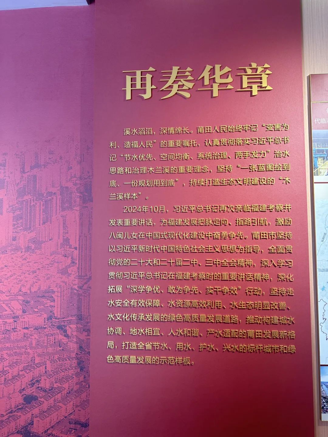 作为滋养莆田千年的“母亲河”,木兰溪宛如一部流动的史书见证着城市的沧桑变迁。木兰溪治理展示馆中的史料化作“镜头”,向大家展示着这条河流从水患频发、百姓忧惧的“水患之河”,一步步蝶变为生态秀美、惠泽民生的“生态之河”,再到赋能发展、孕育希望的“发展之河”的华丽轨迹,成为人们感悟领袖治水智慧、传承生态文明理念的重要窗口。