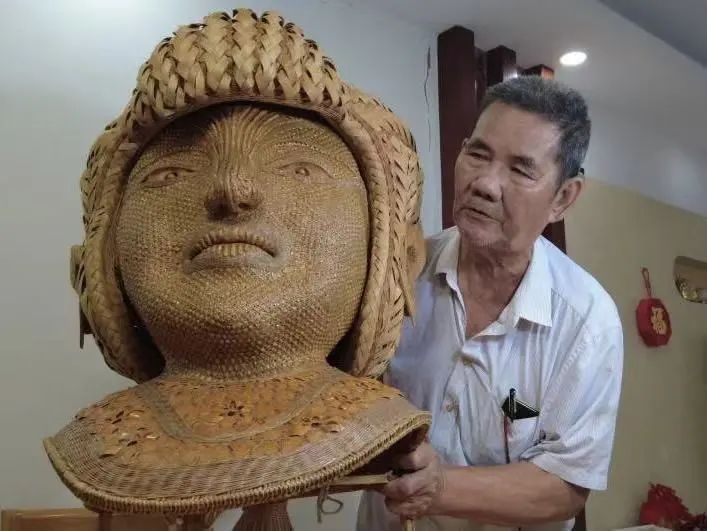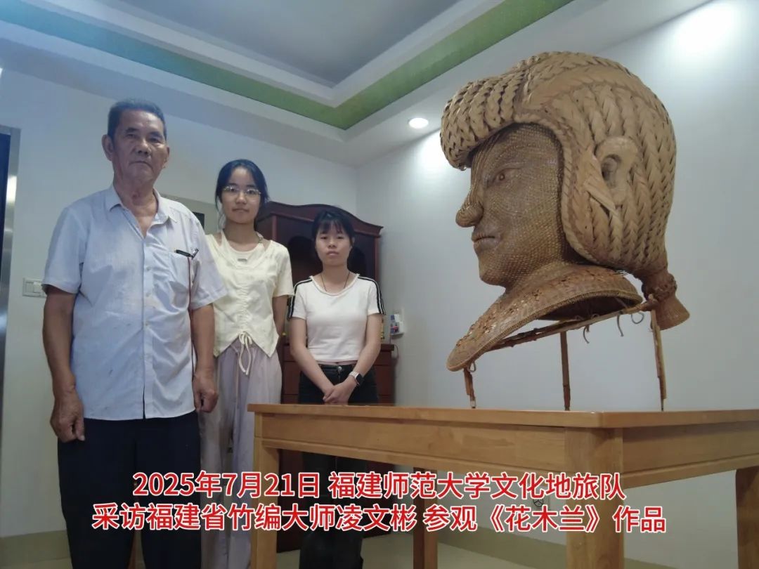 7月21日上午,实践队推开不足九平方米的“福建省大师工作室”大门,拜访泉州竹编非遗唯一传承人凌文彬老师。这里虽空间不大,却整齐摆放着各式竹编工具与半成品,每一件都承载着凌老师与竹编相伴的岁月印记。在凌老师的带领下,实践队细细观摩了他创作八年的代表作《花木兰》。这件作品仅在人物面部就融合了八种不同的编织技法,竹丝的交错间赋予了人物鲜活的生命力。凌老师从青涩少年到白发老者,“一坐一编,就是六十年”。