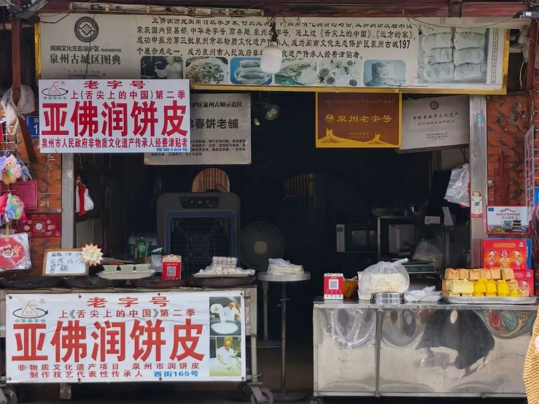 古巷悠长,市井繁华。7月20日上午,实践队走进泉州西街,探寻藏于街巷中的非遗美食与传统技艺。通过实地探访、技艺观摩等形式,体悟古城非遗文化在生活中的生动延续。在非遗制作技艺代表性传承人傅亚佛的润饼店,实践队成员近距离观摩了润饼的制作过程:从薄如蝉翼的饼皮摊制,到十余种馅料的精心搭配,每一个步骤都展现着传承人精湛的技艺和对传统的坚守。那香气四溢的润饼,不仅是闽南风味的代表,更生动诠释了“非遗即生活”的深刻内涵,让实践队成员真切感受到非遗与日常的紧密相连。