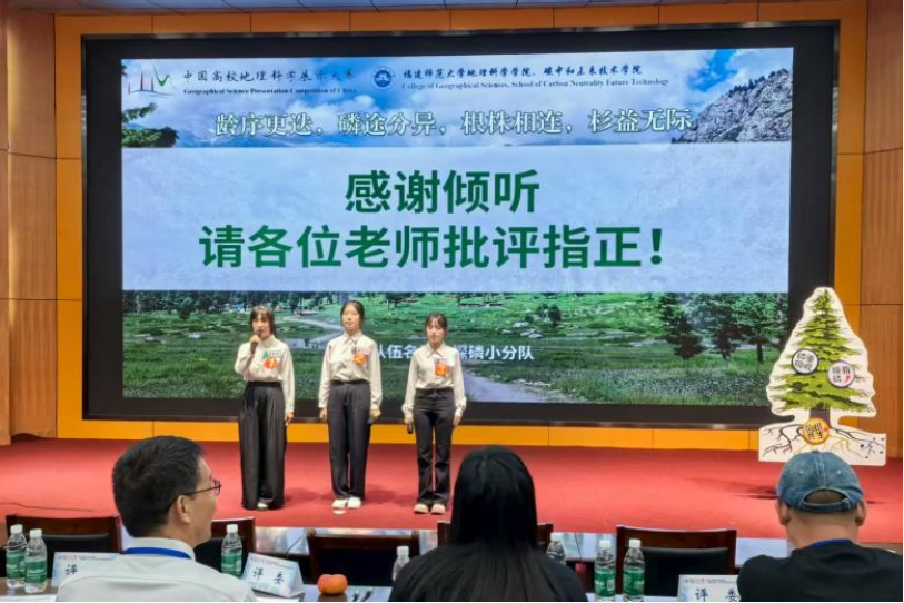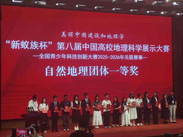 据悉,中国高校地理科学展示大赛是我国地学领域发起最早、影响最广、专业性最强、认可度最高的全国性大学生学术能力竞赛活动,2025年,中国高校地理科学展示大赛正式入选“全国青少年科技创新大赛2025-2026年关联赛事”。本次大赛汇聚了包括北京大学、南京大学、北京师范大学、中山大学等近百所国内知名高校的数百支队伍同台竞技。我院探磷小分队聚焦前沿自然地理科学问题,凭借新颖的选题、详实的数据和严谨的论证展现研究深度。总决赛现场,队员们沉着应战、配合默契,通过清晰的陈述、专业的可视化呈现与有力的思辨,充分阐释了研究成果的科学价值与现实意义,赢得了评委专家的一致好评,最终斩获自然地理组团体一等奖。