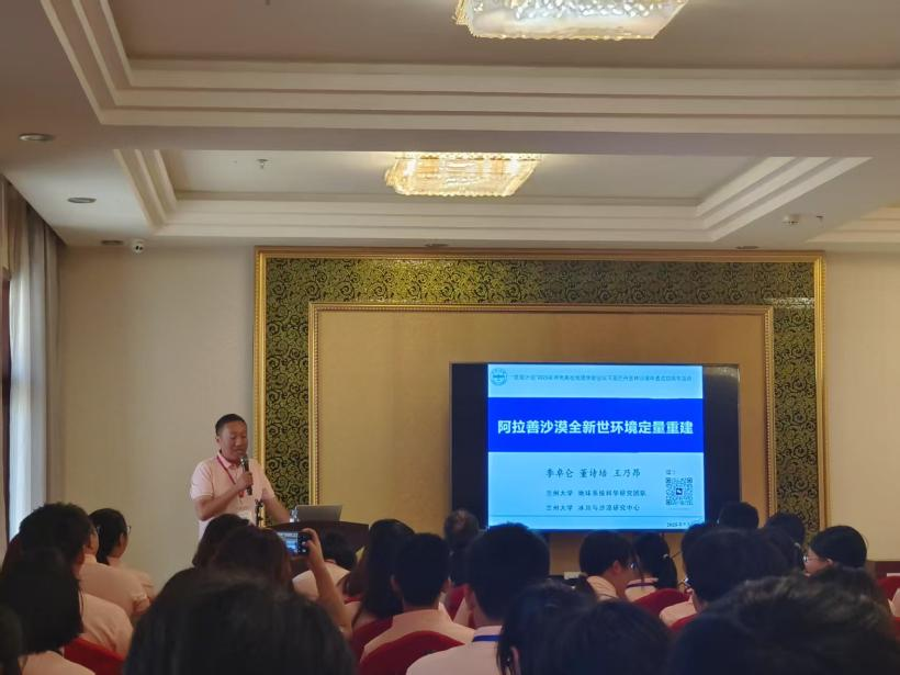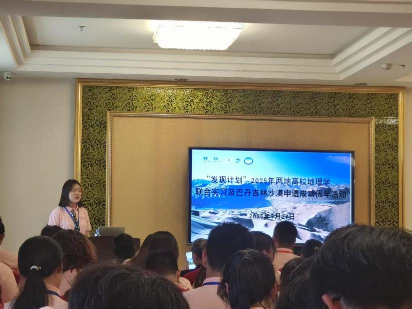 下午,同学们来到了阿拉善地质公园博物馆报告厅,在这里召开世界自然遗产“巴丹吉林沙漠——沙山湖泊群”申遗成功一周年座谈会,世界自然遗产保护中心讲解员向师生们介绍了世界自然遗产“巴丹吉林沙漠—沙山湖泊群”,李卓仑老师也作了题为《阿拉善沙漠全新世环境定量重建》的学术报告。主要介绍了他们团队所完成的三大研究成果:创建了定量重建沙漠腹地气候变化幅度的新方法,发现了钙质根管这一对环境指示的新材料,以及揭示了沙漠演化过程的气候阈值和其驱动机制。