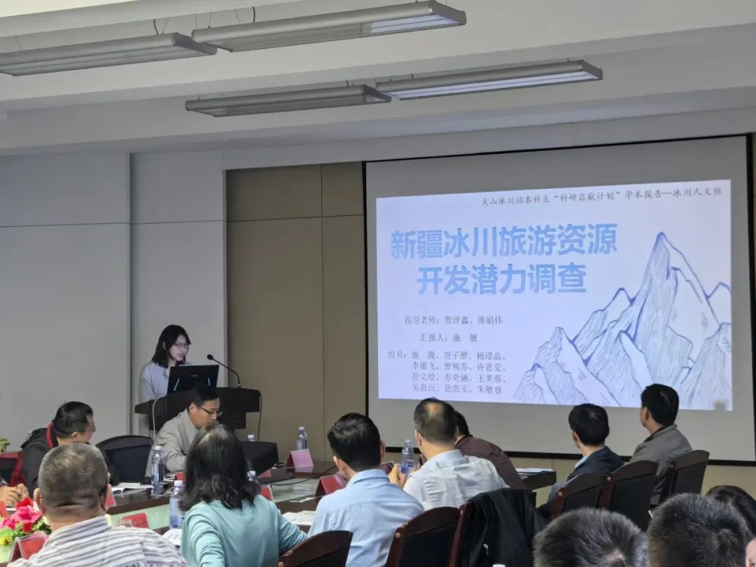 在高校实习生学术汇报环节,水文组展示了冰川变化对天山北坡白杨河流域径流的影响研究,重点分析乌鲁木齐河流域的径流变化趋势、水资源供需矛盾以及潜在水资源风险,评估冰川消融对河流径流、流域系统稳定性的影响。遥感组则以通俗易懂的语言,将给冰川编目比喻为“给冰川上户口”,介绍了CGI-XJ2020冰川编目编制方法,从遥感视角走进冰雪世界。我院施靓同学则代表冰川人文组进行了“新疆冰川旅游资源开发潜力调查”汇报,聚焦冰川旅游的可持续发展,表明“冰川旅游的持续开发与科学管理必须并重”的观点,在冰川消融的背景下,对于冰川要在消失前拥抱还是为未来封存展开深刻思考。