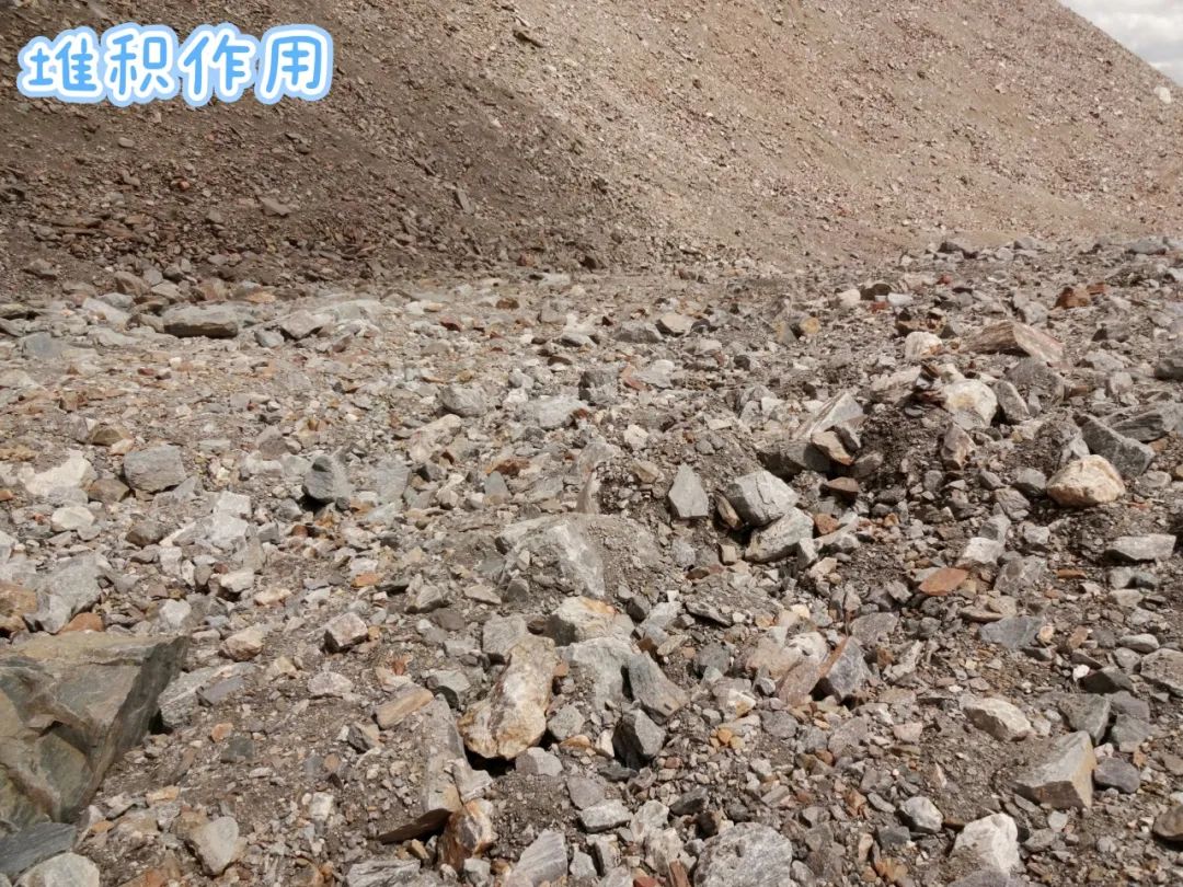 堆积作用:冰川消融或运动速度减缓时,冰川所携带的碎屑物质)因失去冰川的搬运力而沉积下来的过程。