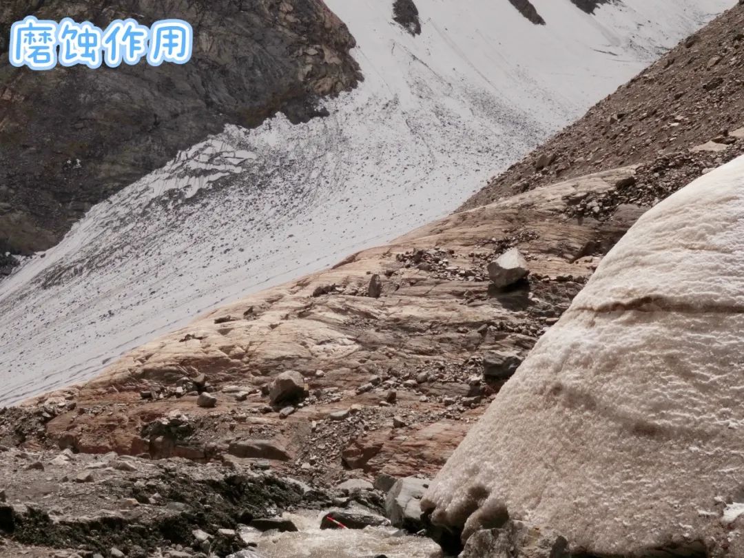 磨蚀作用:冰川在运动过程中,其底部和两侧携带的岩石碎屑会像砂纸一样摩擦冰川床,使岩石表面被打磨、刻蚀,形成光滑的擦痕、磨光面等。