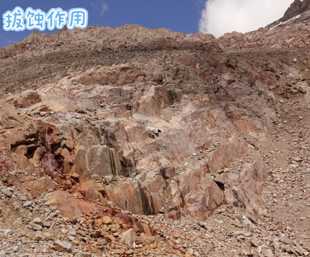 拔蚀作用:拔蚀作用是冰川侵蚀的一种辅助方式。冰川运动时,其底部的冻结层会黏附地表的岩石碎块,当冰川向前移动时,这些被黏附的岩块会被强行“拔起”并随冰川一起搬运,导致地表岩石出现破碎和剥离,进一步加剧冰川对地表的侵蚀。