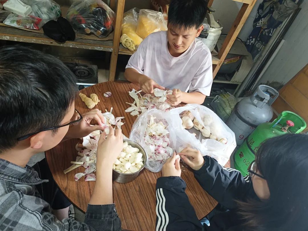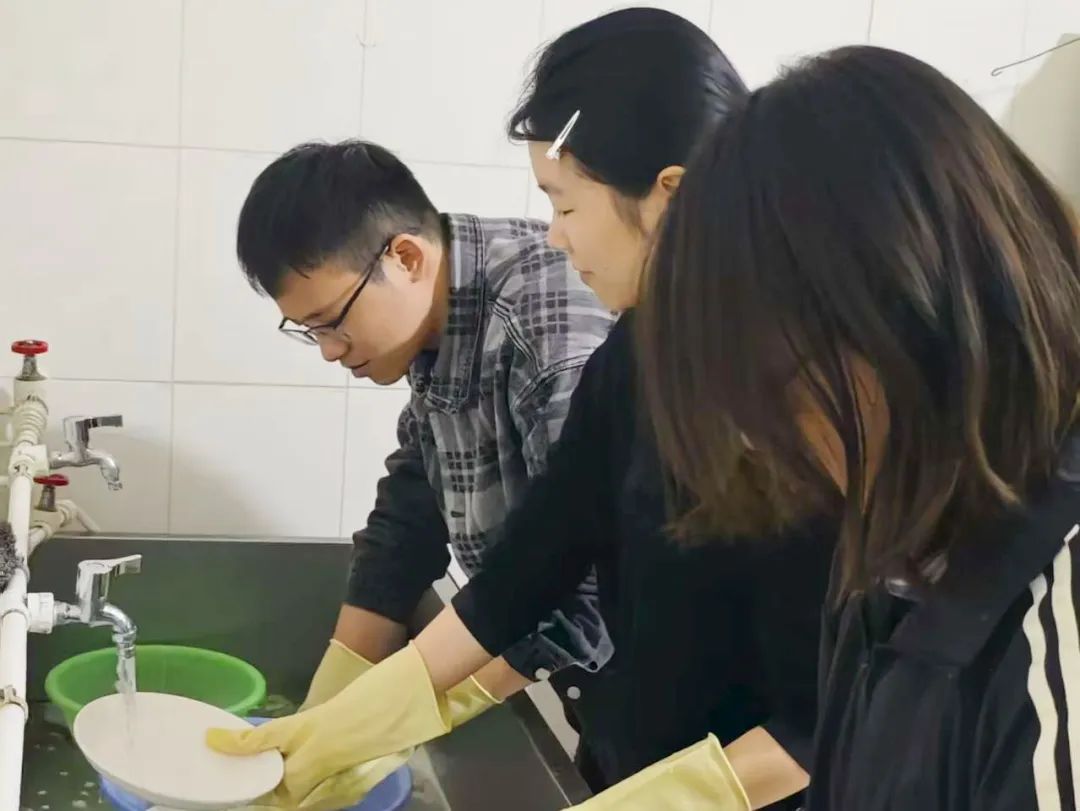 除了卫生轮值,帮厨是同学们每日的重要任务。厨房工作人员列好当日食材清单后,同学们按分工有条不紊地洗菜、切菜、削皮、洗碗。共同劳动让同学们体会到后勤工作的辛劳,拉近了彼此距离,也对“一粥一饭,当思来之不易”有了更真切的感悟。