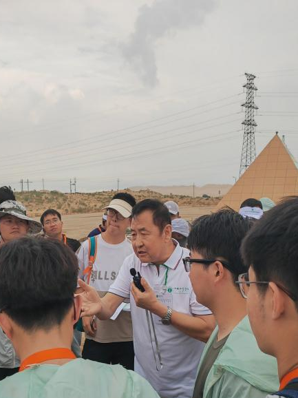 8月4日下午,实习小队前往鄂尔多斯市的中国第七大沙漠——库布齐沙漠,库布齐蒙语意为“弓上之弦”,即黄河几字湾为弓,大漠为弦,是挂在黄河几字湾上的沙漠。其宏观地貌为:西有贺兰山、桌子山,北有乌拉山、大青山,平均海拔比鄂尔多斯高原高100米,被称为“高原中的高原”。区域内多流动沙丘,地形地貌呈东西走向;沙丘高15—30米,其中流动沙丘面积最大,半固定沙丘次之,平缓沙丘最小。在此,吴永胜教授为我们重点介绍了固沙技术与生物结皮的相关内容,赛西雅拉图等教授介绍了库布齐沙漠的区域概况和主要植被类型等内容,让实习师生对库布齐沙漠的地理特征、生态现状及治理技术有了更为系统且深入的认知。