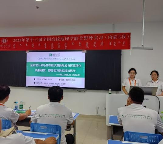 讲座结束后,中期汇报有序开展。各高校实习小组依次就内蒙古段近几日的实习成果进行总结汇报,内容涵盖乌兰布和沙漠考察、三盛公水利枢纽调研、库布齐沙漠治理观察、包头城市转型探究及草原生态水文考察等方面,重点呈现了实地观察所得、理论应用情况及初步研究思考。评委老师对各小组的实习成果予以点评,肯定亮点的同时提出针对性改进建议,助力同学们完善实习报告,深化对地理问题的系统性认识。