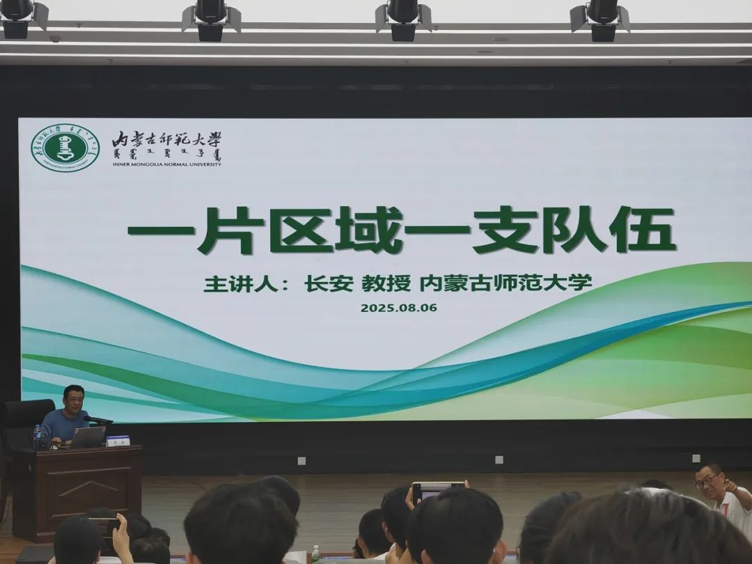 紧接着的专业讲座环节,前半部分由内蒙古师范大学地理科学学院院长长安教授主持。华东师范大学光华书院院长郑祥民教授以“全国地理学跨区域实践平台建设与拔尖人才培养”为主题,重点阐述了野外实践教学的必要性和实践要求,并对历届联合实习的实施方案进行了简要介绍。陕西师范大学副校长董治宝教授围绕“巴丹吉林沙漠高大沙山-湖泊系统的形成”展开专题讲座,聚焦高大沙山的形成、湖泊的形成与湖水来源、沙山与湖泊的关系三个核心方面进行了详细讲解。