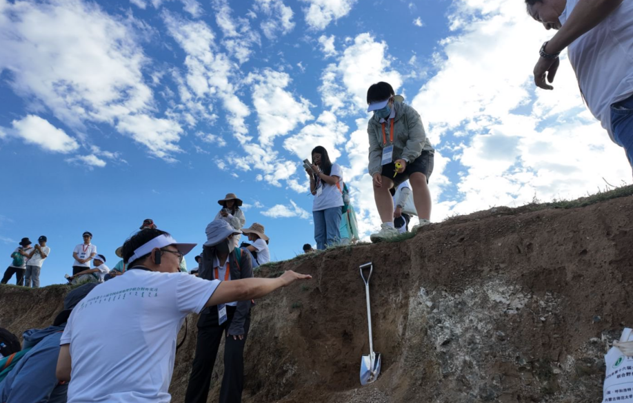 随后,实习小队走进希拉穆仁草原(召河草原),这里地处阴山山地与内蒙古高原过渡地带,地形以平均海拔约1600米的低山丘陵为主,地表由沉积岩和岩浆岩构成,景观平坦开阔;因属中温带半干旱大陆性季风气候,干旱多风、冬季寒冷、夏季雨量集中,年均降水量仅284毫米而蒸发量巨大,孕育了地带性的栗钙土。经过现场修整使土壤露出新鲜剖面后,内蒙古师范大学的苏根成教授详细讲解了该土壤剖面,并指出从上到下依次为暗棕色的腐殖质层(Ah;0-40 cm)、灰白色的钙积层(Bk;40-130 cm)和青灰色的母质层(C;130 cm以下)。通过实地学习考察,实习师生们系统认识到气候-土壤-植被的地带性分异规律和内在耦合机制,对草原生态系统的脆弱性和适应性特征有了更深入的了解。