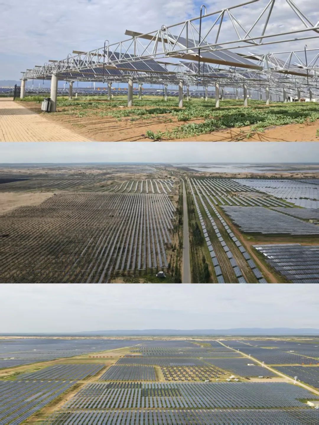 随后,实习小队前往位于杭锦旗独贵塔拉镇的亿利阳光谷,这是一处以光伏发电为核心,融合生态农业、畜牧业发展的现代化绿色产业示范基地。该区域光照时间在3180小时以上,经过三十多年的持续治理,沙漠生态环境得到了极大改善,区内交通、用水、装备制造等工业基础逐步完善,有多个500 KV的变电站和多条特高压外送通道,并有多个大型工业园在区域内可消纳绿电,发展光伏治沙条件成熟。实习师生们在这里考察了“板下种植”的农光互补实践和“板间养殖”的牧光互补模式,探究了“公司+农户”的社会经济效益,体会到光伏设施在治沙中的物理作用以及该区域人地关系的协调发展。