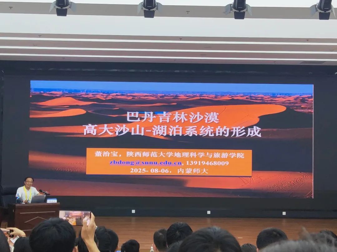 紧接着的专业讲座环节,前半部分由内蒙古师范大学地理科学学院院长长安教授主持。华东师范大学光华书院院长郑祥民教授以“全国地理学跨区域实践平台建设与拔尖人才培养”为主题,重点阐述了野外实践教学的必要性和实践要求,并对历届联合实习的实施方案进行了简要介绍。陕西师范大学副校长董治宝教授围绕“巴丹吉林沙漠高大沙山-湖泊系统的形成”展开专题讲座,聚焦高大沙山的形成、湖泊的形成与湖水来源、沙山与湖泊的关系三个核心方面进行了详细讲解。