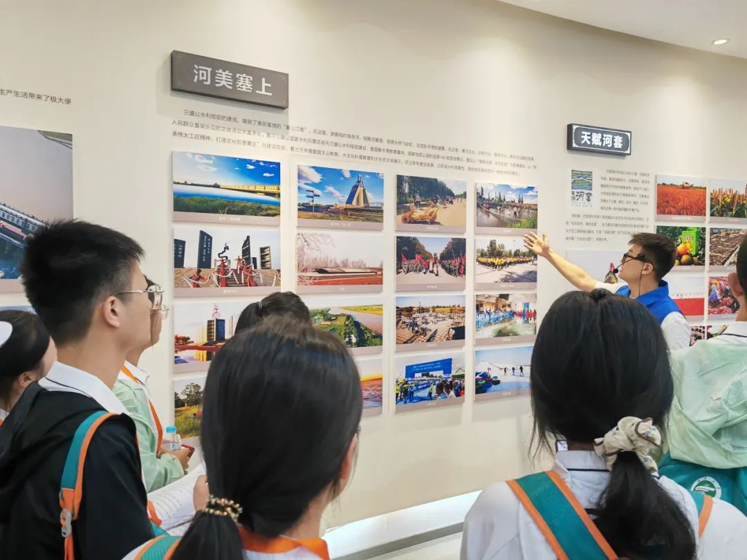 8月4日上午,实习小队来到了内蒙古自治区巴彦淖尔市磴口县三盛公黄河水利枢纽。三盛公水利枢纽位于河套平原与乌兰布和沙漠交界处,黄河北岸几字湾头,是黄河干流上游的大型闸坝工程,也是河套灌区的引水龙头工程。工程以灌溉为主,兼顾防洪防凌、发电、工业供水、交通及旅游等综合效益。在讲解员的带领下,实习师生参观了黄河三盛公水文化博物馆和铸牢中华民族共同体意识主题广场,通过数字沙盘和全息影像等技术,认识了河套灌区的总干渠等灌溉渠道,了解了灌溉网络布局及灌溉水源的分配与利用方式。此次考察不仅让队员们的水文水资源专业知识得到了切实拓展,更让大家深刻感悟到,作为孕育中华民族的母亲河,黄河的每一次治理、每一步开发,都始终承载着各族儿女的共同愿景,凝聚着跨越地域与民族的集体智慧。
